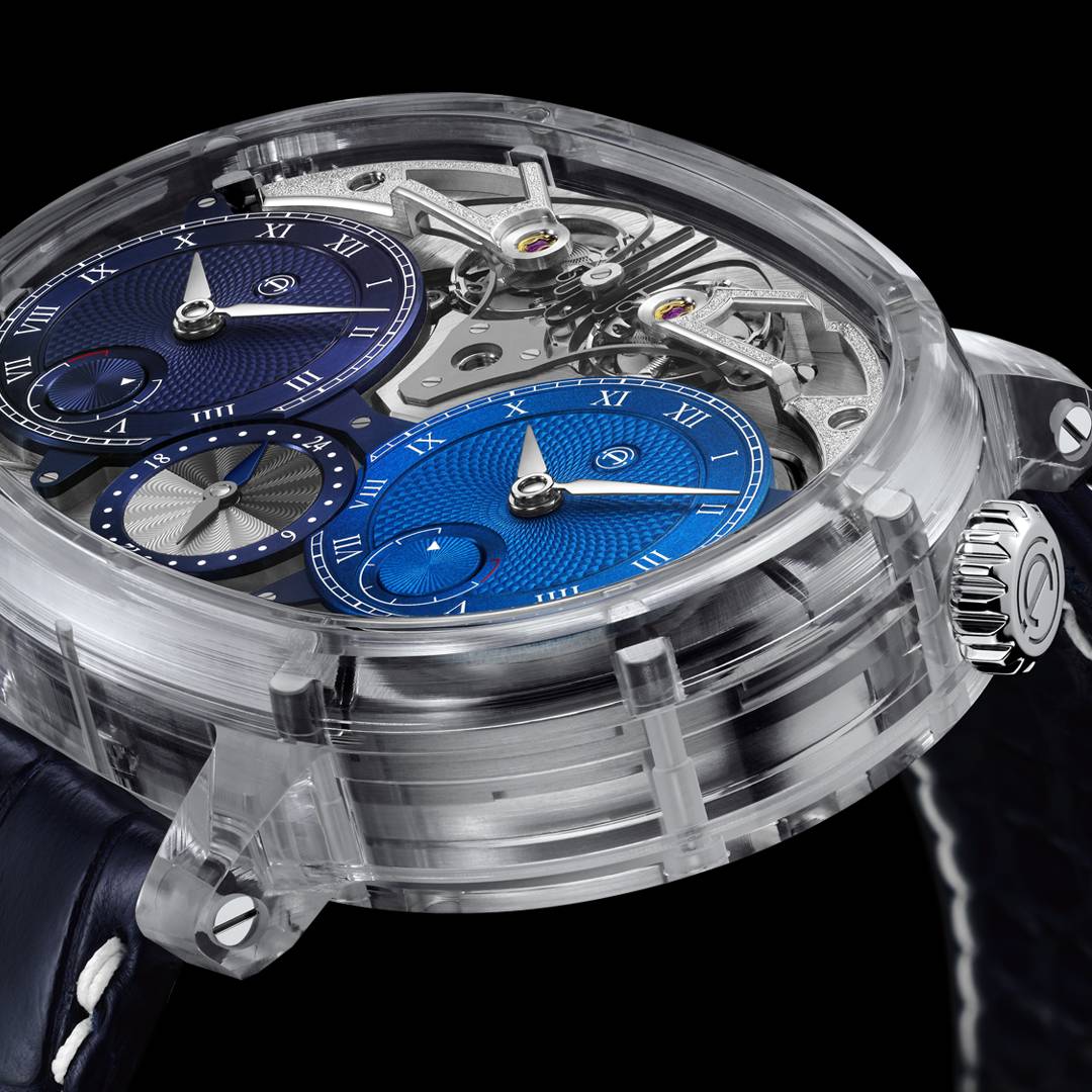 A sapphire-cased dual-time resonance watch featuring twin synchronized regulators, hand-guilloché dials, and the manually wound ARF17 calibre. Limited to 8 pieces.