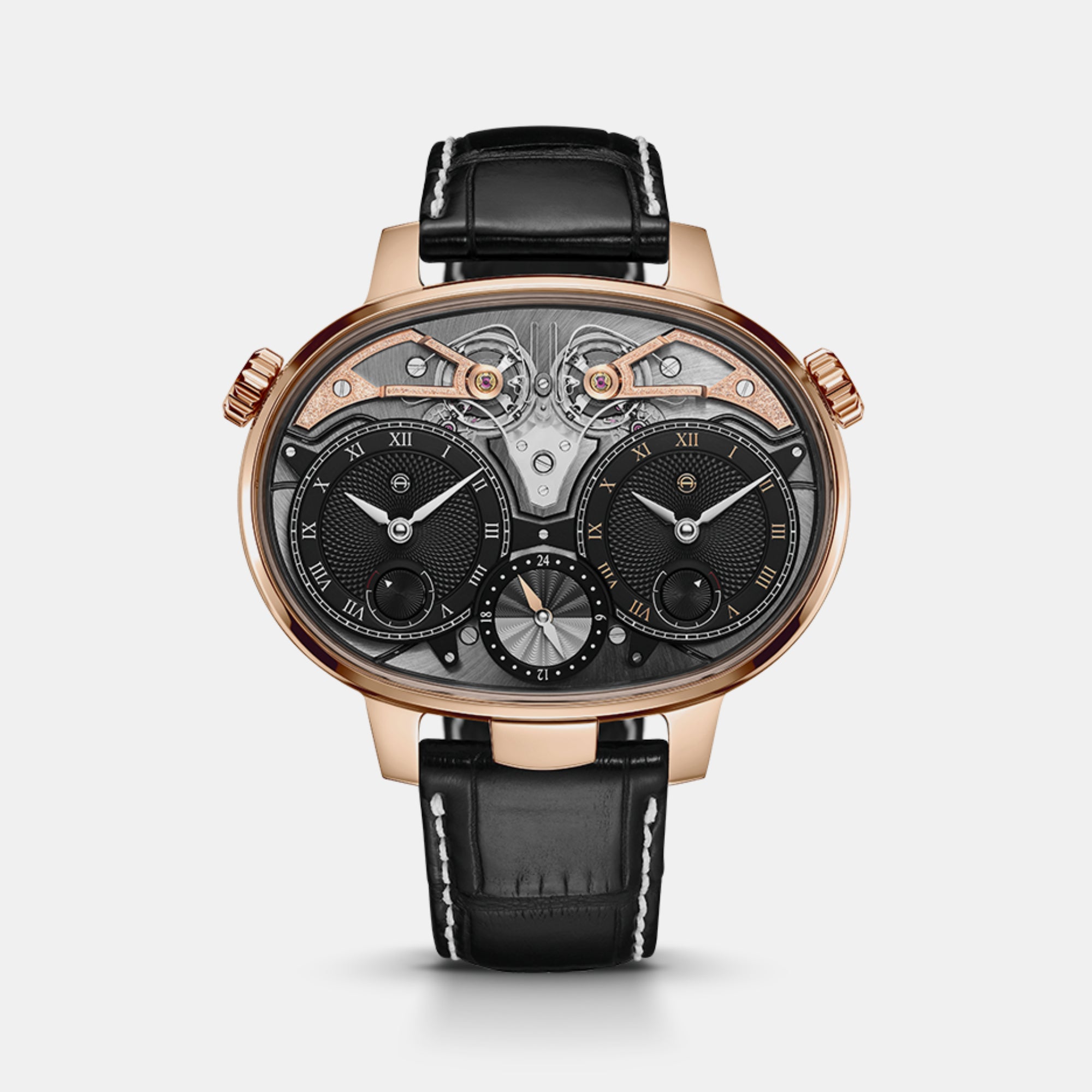 The Dual Time Resonance is powered by our oval-shaped ARF-17 movement, designed and developed entirely in our manufacture. Housed in a unique, bold yet elegant oval case, the two independent dials seem to float within, creating a mesmerizing sense of depth. Like all our Resonance timepieces, it offers a dynamic display of balance springs beating together in perfect harmony. Enhancing its functionality, the Dual Time Resonance features two cone-guided power reserve indicators, ensuring a precise and intuitive display of remaining energy.