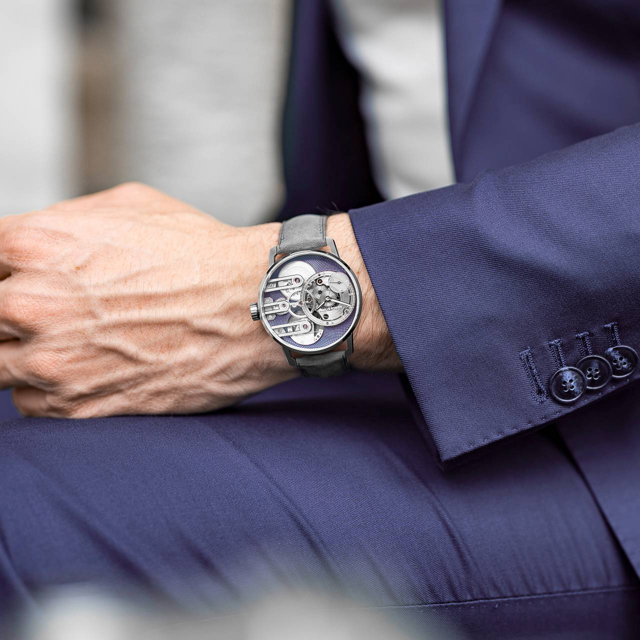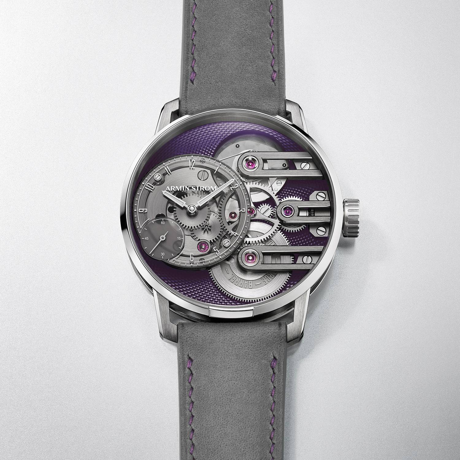 Housed in a 41 mm stainless steel case, the Gravity Equal Force Purple blends contemporary transparency with classical handcraft. Faceted, polished hands with Super-LumiNova® ensure legibility without competing with the mechanics beneath. Paired with a grey nubuck leather strap accented by purple stitching, this edition amplifies the visual drama of an already groundbreaking watch — without ever losing its sense of purpose.