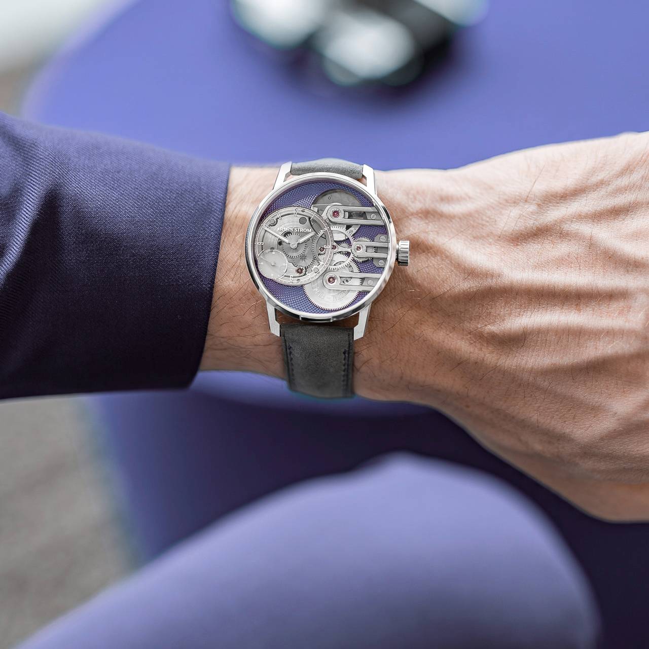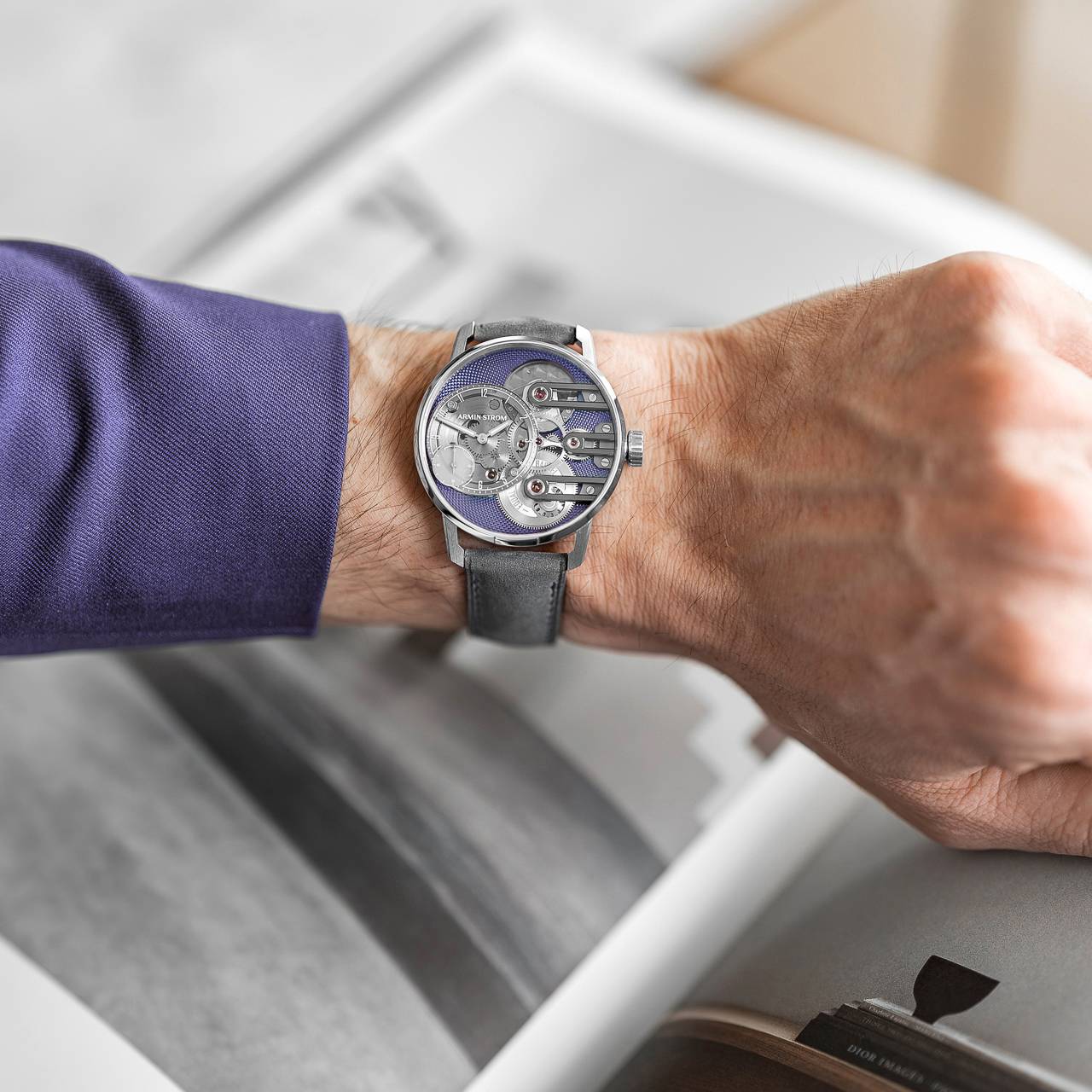 A 41 mm stainless steel automatic timepiece featuring a grey sapphire offset dial, patented Equal Force Barrel, and a purple guilloché movement plate handcrafted by Kari Voutilainen.
