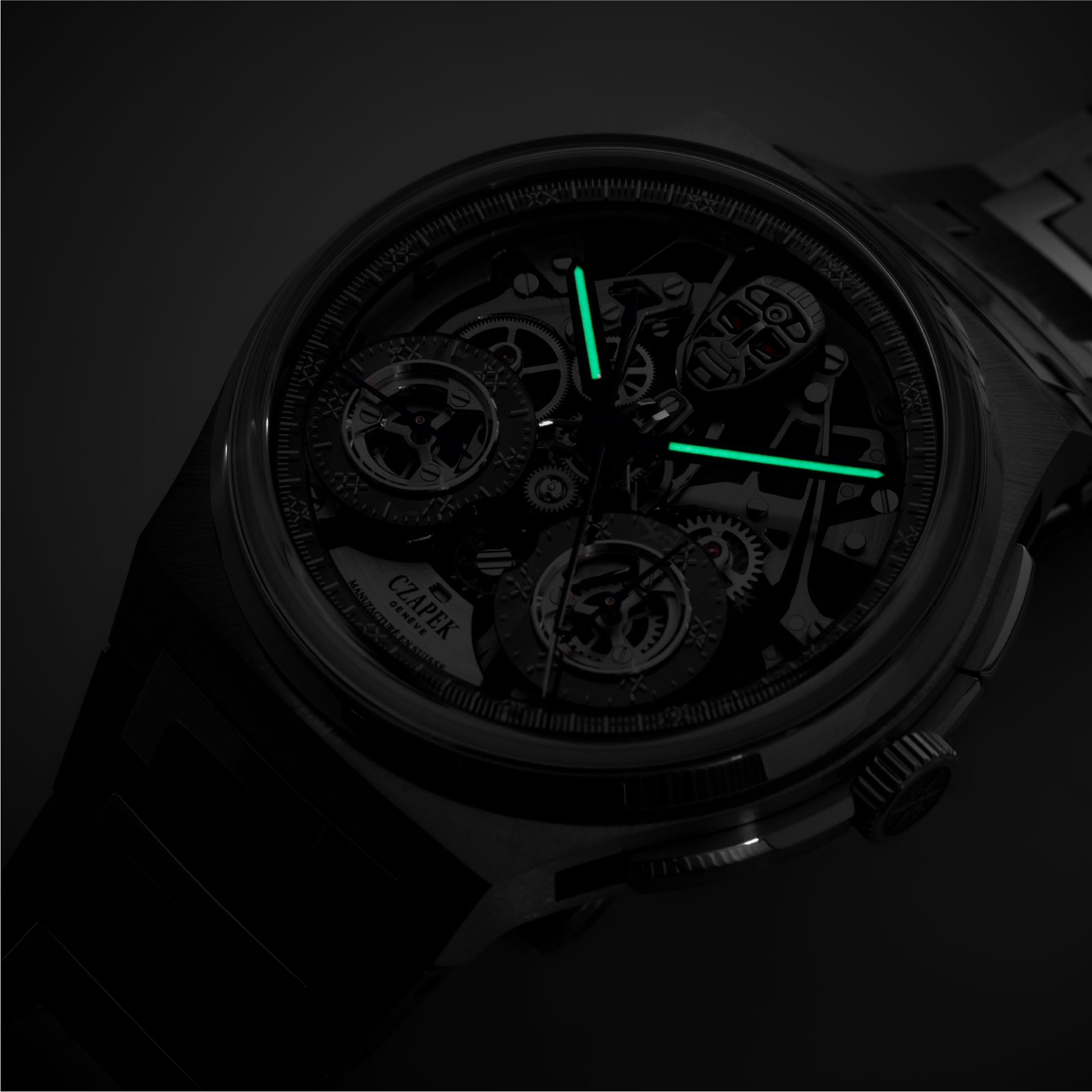 The Antarctique Rattrapante R.U.R. is Czapek & Cie’s boldest take yet on its signature split-seconds chronograph. Beneath a grey-metallised sapphire dial, a titanium robot head — hand-polished, laser-engraved, and micro-painted — animates with every press of the chronograph pushers. Start, its eyes flash yellow. Stop, they burn red. Reset, they glow blue. A playful animation, hardwired into haute horlogerie.