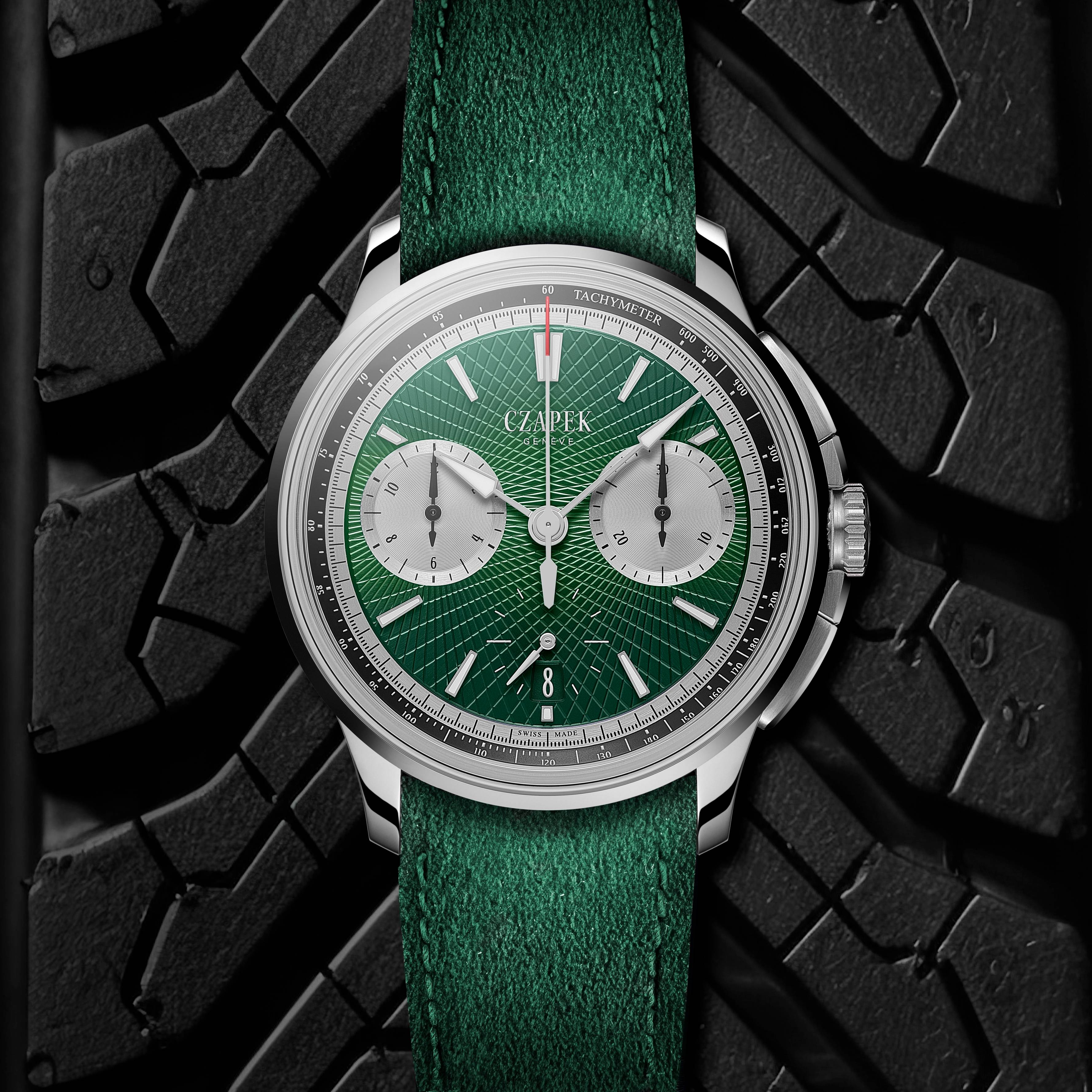 A high-frequency integrated chronograph in Victory Green, limited to 18 pieces. Refined sportiness powered by Czapek’s SXH3 calibre.