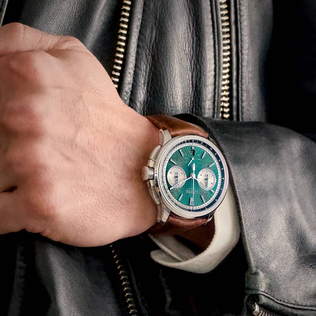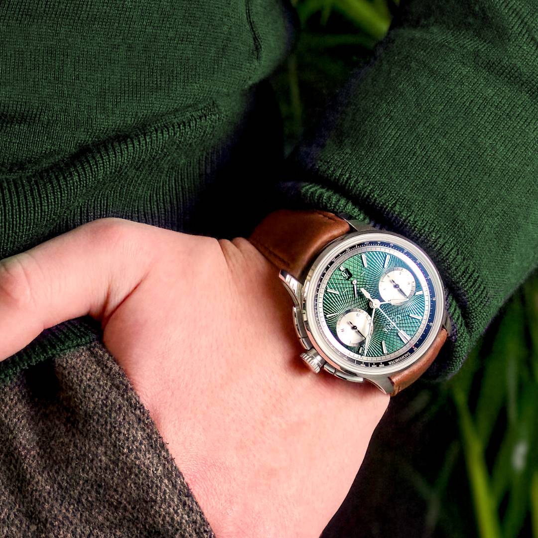 The dial is where it all comes together. A deeply engraved “Double Soleil” guilloché, executed by historic partner Metalem, is finished in an elegant English-green PVD tone — inspired by motorsport heritage and engineered to play with light rather than fight it. Sub-dials are recessed, diamond-polished, and azuraged for clarity without visual noise, while the peripheral tachymeter keeps the layout clean and purposeful.