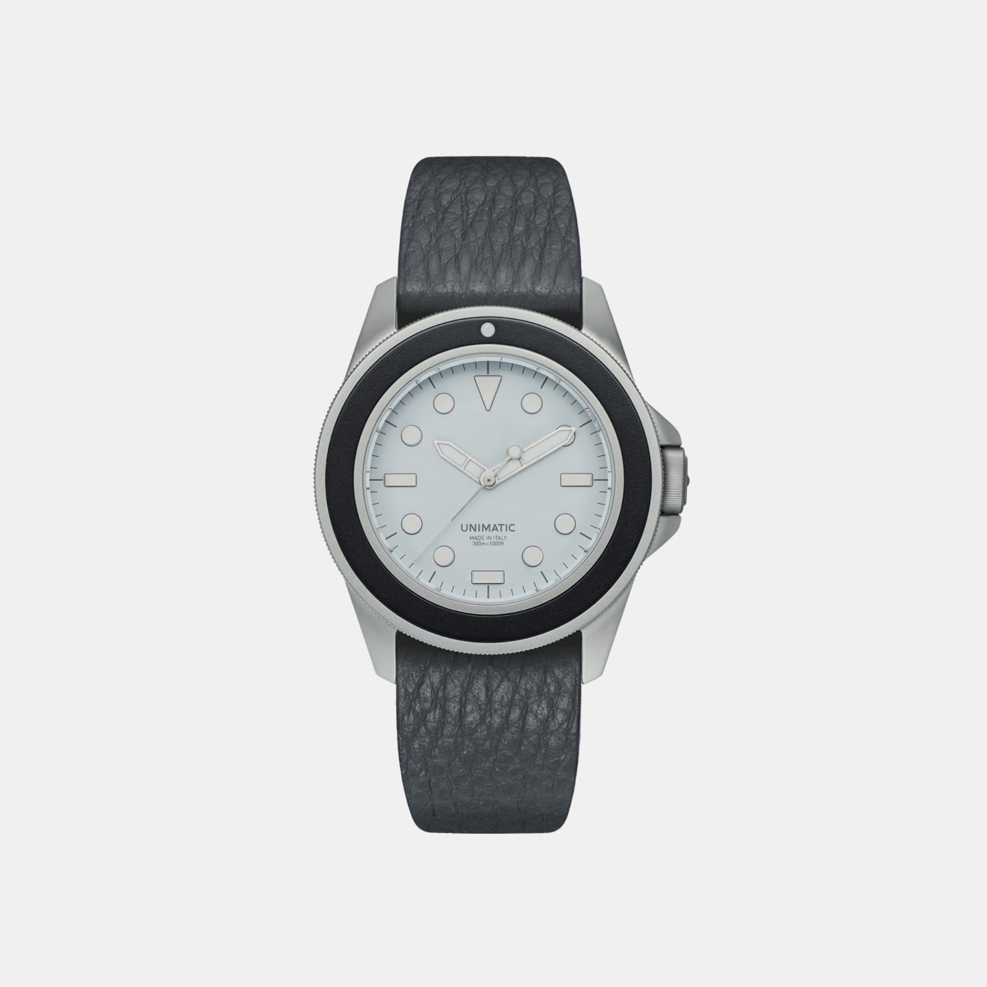 Modello Uno ref. UT1-GO is the Made in Italy UNIMATIC quartz dive watch. It features matte black bezel insert, glacier white dial with hand-applied 3D UNILIGHT markers, dark gray open second rail and dial trims.