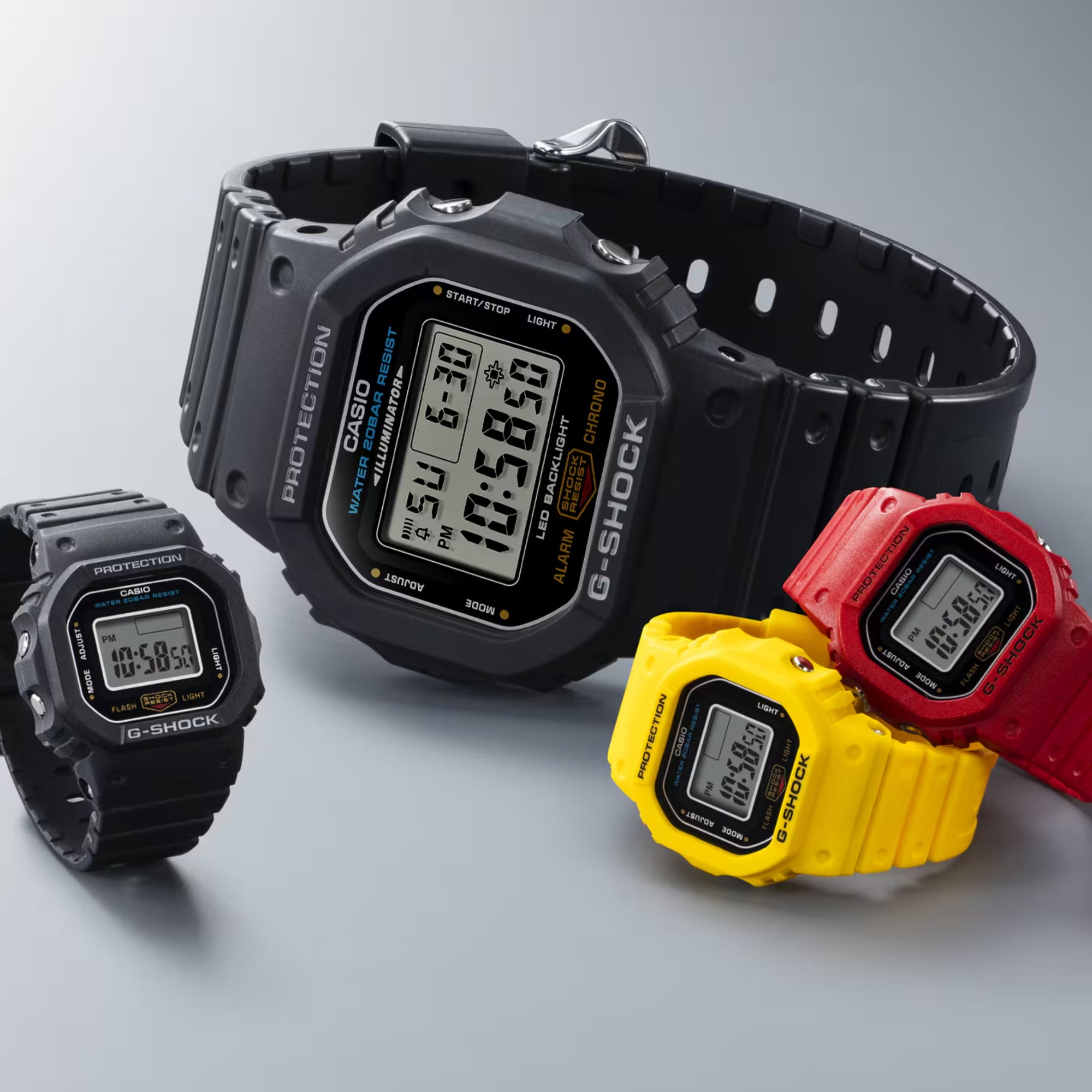 Introducing the G-SHOCK nano, a miniature, finger-fit re-creation of the iconic DW5600 at about one-tenth the size. Delivering impressive detail — from side buttons, to buckle to LCD, all precisely reproduced using advanced molding techniques in a form so compact it comfortably fits on your finger. Shock resistant and water resistant up to 20 bar, this ring-sized watch performs with the toughness of a full-on G-SHOCK,while still allowing the battery to be replaced. Even at this small size, the LCD presents all the info you need — hours, minutes, and seconds, as well as dual time, stopwatch, and auto calendar. A soft, flashing light activates at your chosen time, adding a subtle and emotive glow. The bezel and band are made with bio-based resin, reflecting a commitment to environmental sustainability. Choose your favorite of the three most popular colors in DW-5600 history — black, yellow, or red. Each G-SHOCK nano comes in a special package with a dedicated silicone stand, for a timepiece that’s infinitely wearable and collectible.