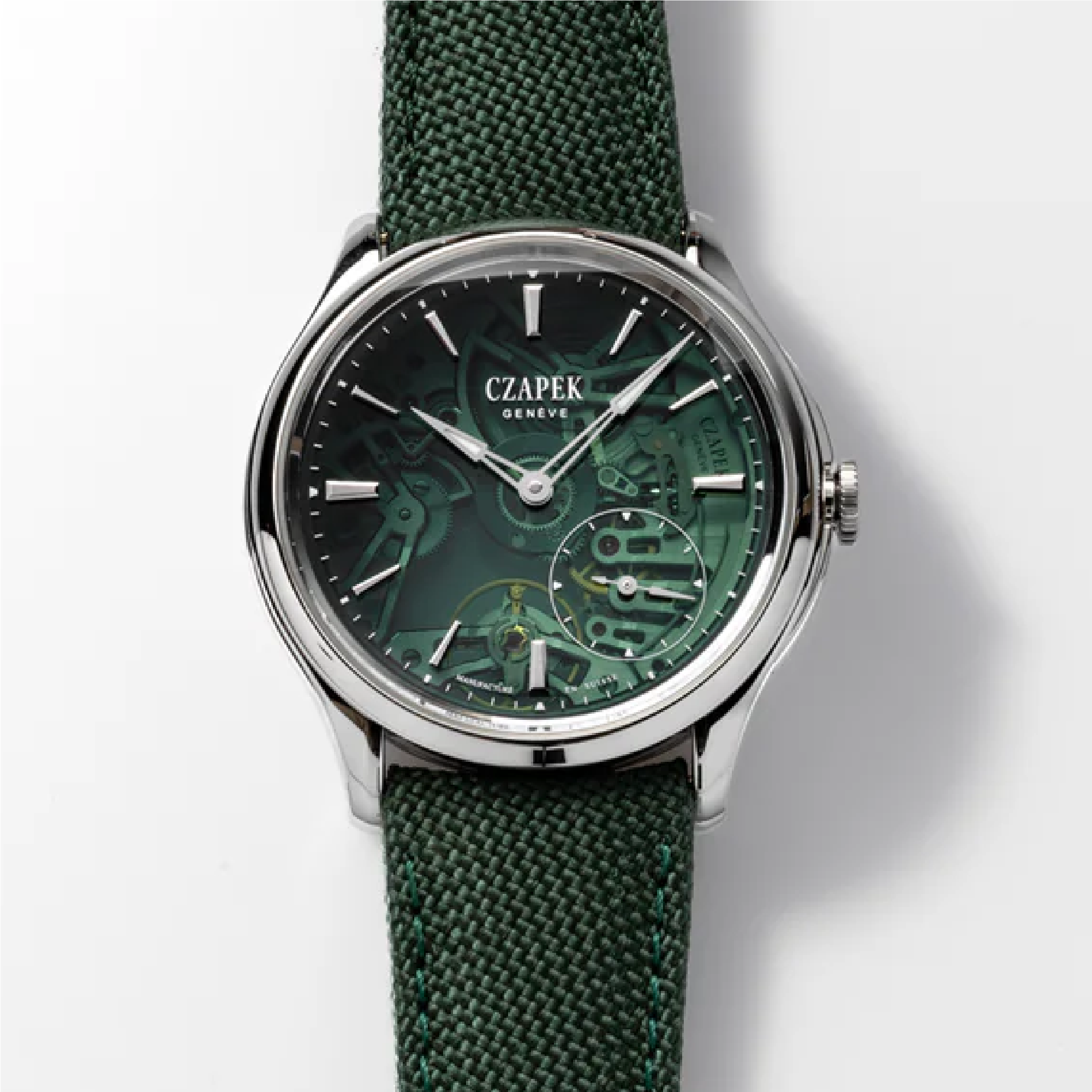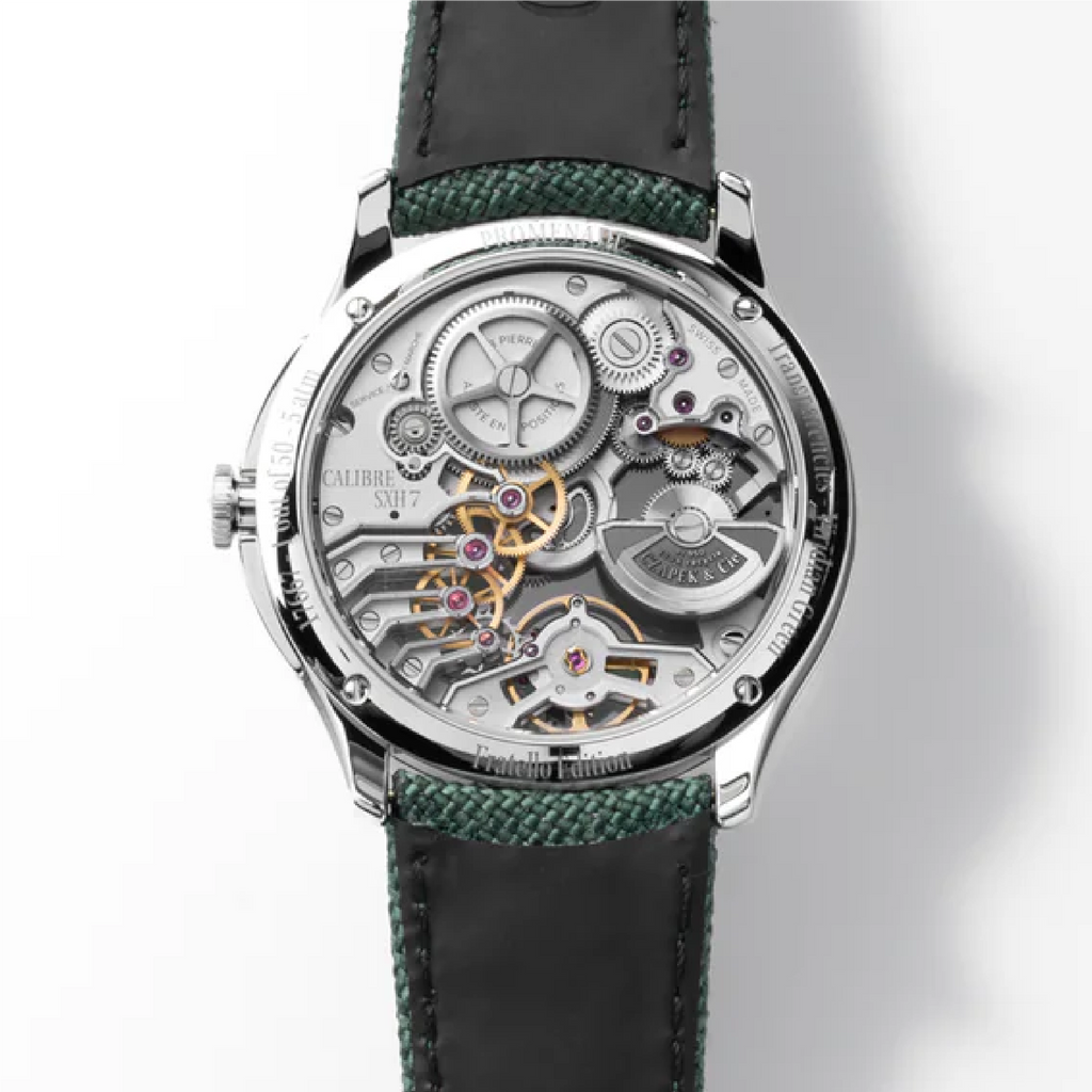 A collaboration born at the crossroads of art and horology. The Czapek × Fratello Promenade Transparencies “Viridian Green” takes its name from the Parisian pigment discovered in 1838—once rare, radical, and beloved by impressionists. Today, that same spirit glows through a smoked green sapphire dial, opening a window into the skeletonized SXH7.1 calibre with recycled platinum micro-rotor.