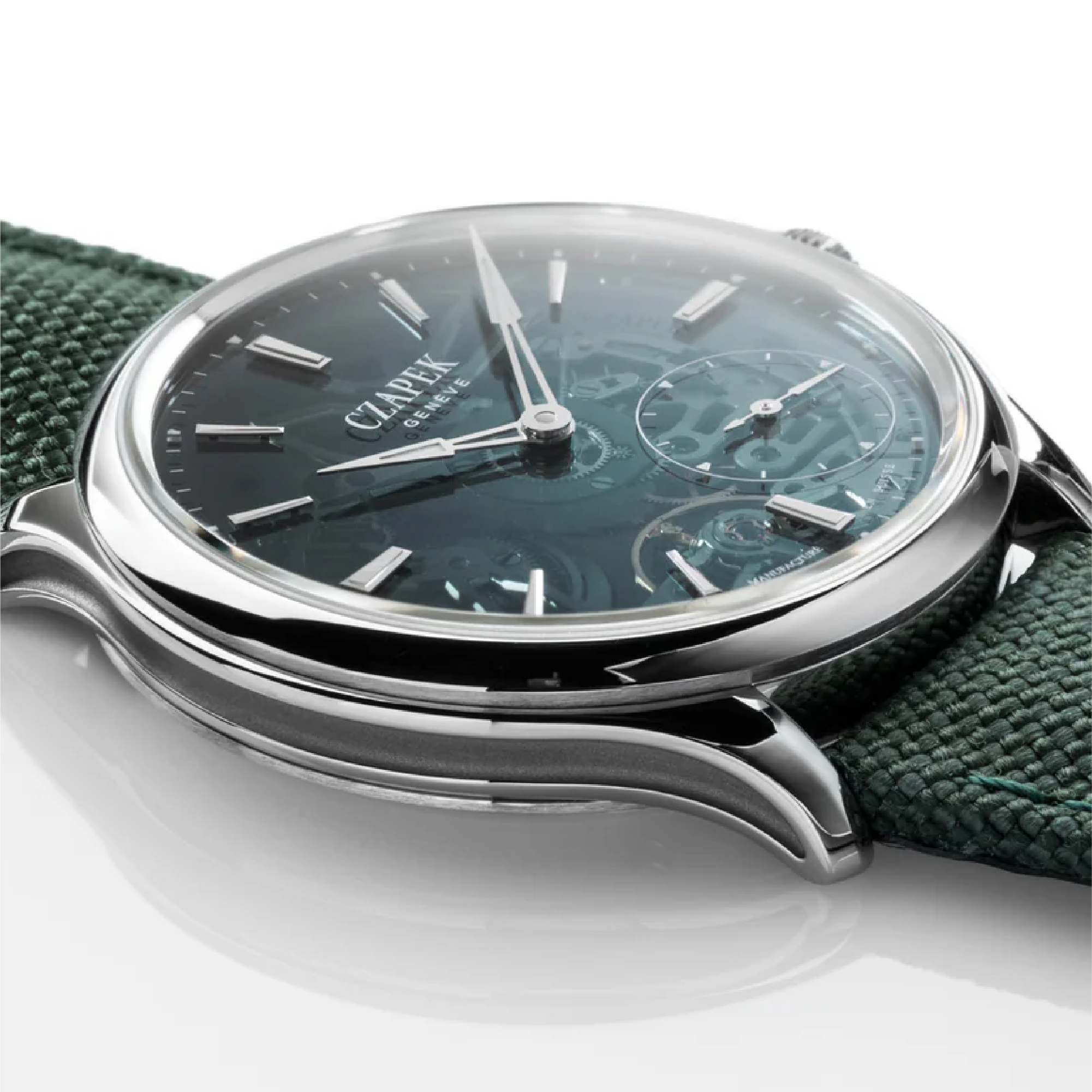 This is the Promenade reimagined: refined in silhouette, contemporary in presence, and limited to just 50 pieces worldwide. A green Cordura strap grounds the piece in versatility, while the transparent fumé dial shifts shades under the light—an everyday reminder that art and time are inseparable.