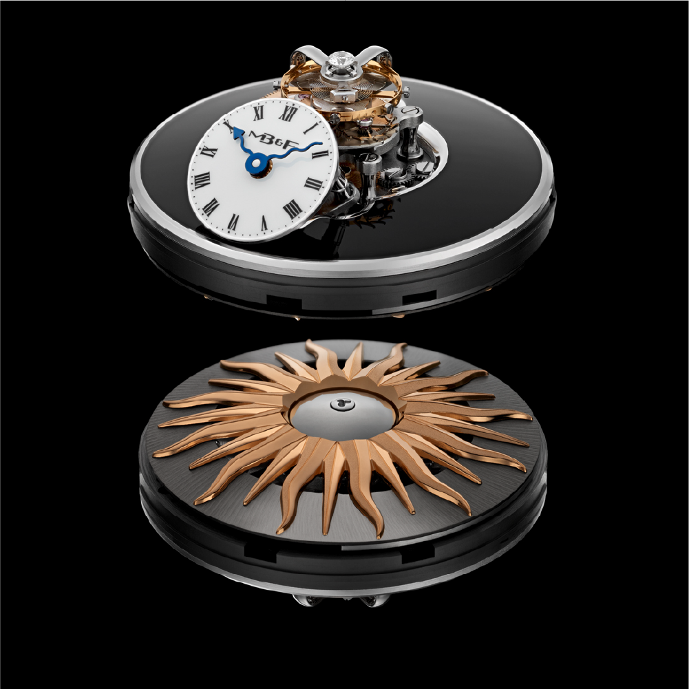 Turn the watch over and a sun-shaped automatic rotor in red gold delivers four full days of power reserve — a recurring symbol of life, energy, and gravity.