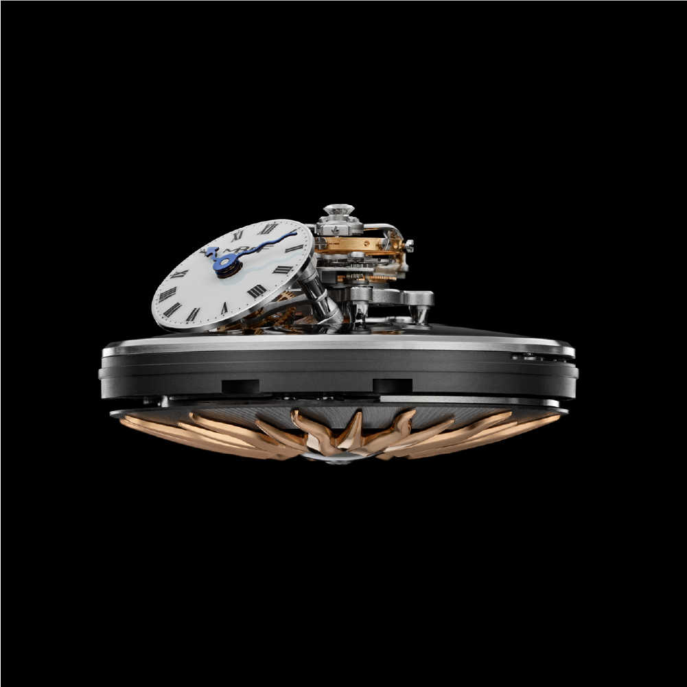 Time is displayed at 7 o’clock on a dial inclined at 50°, readable only by the wearer. A private exchange. A quiet refusal to perform for anyone else.