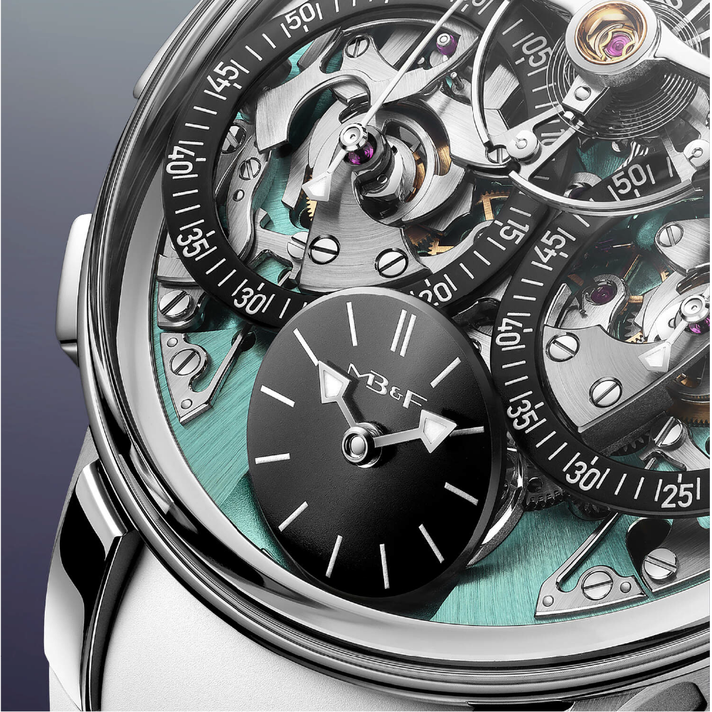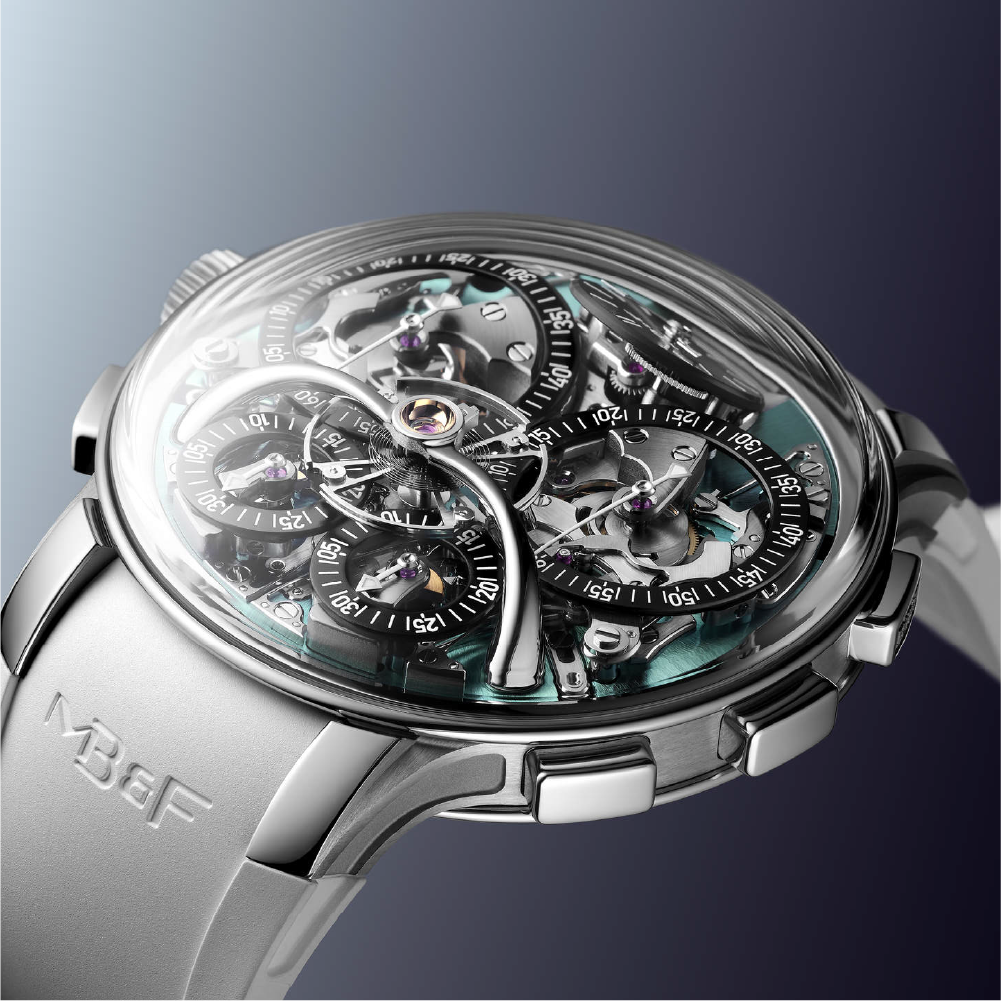 The Legacy Machine Sequential Flyback EVO pushes MB&F’s radical chronograph concept even further. Housed in a Grade 5 titanium EVO case and paired with an aquamarine dial plate, this latest evolution introduces flyback functionality to both chronographs, alongside a newly inclined time display for improved legibility.