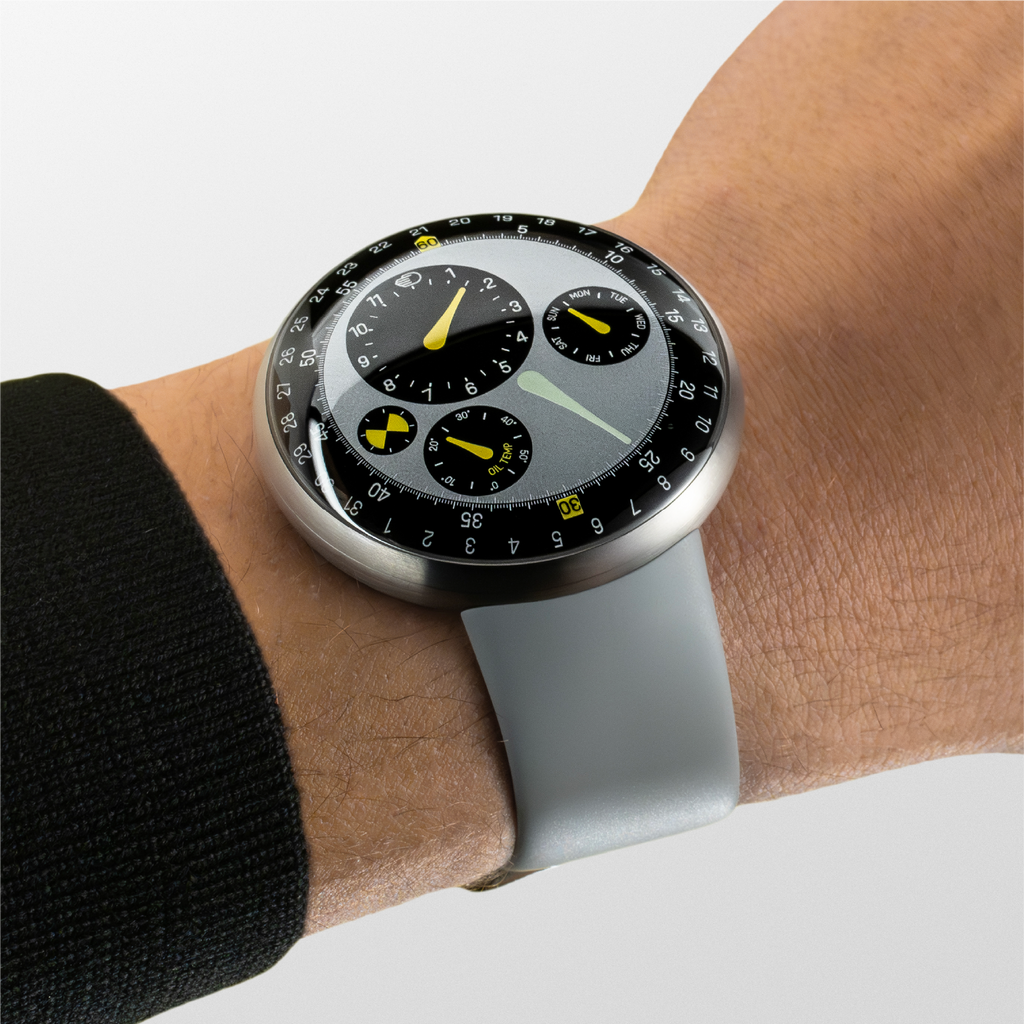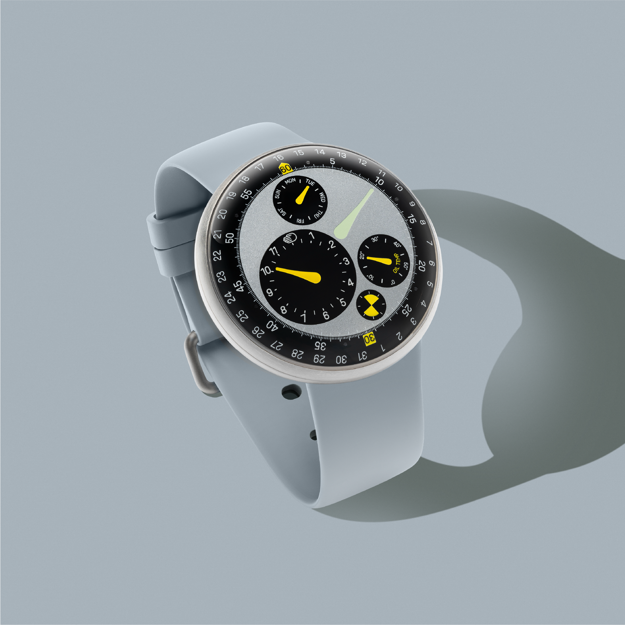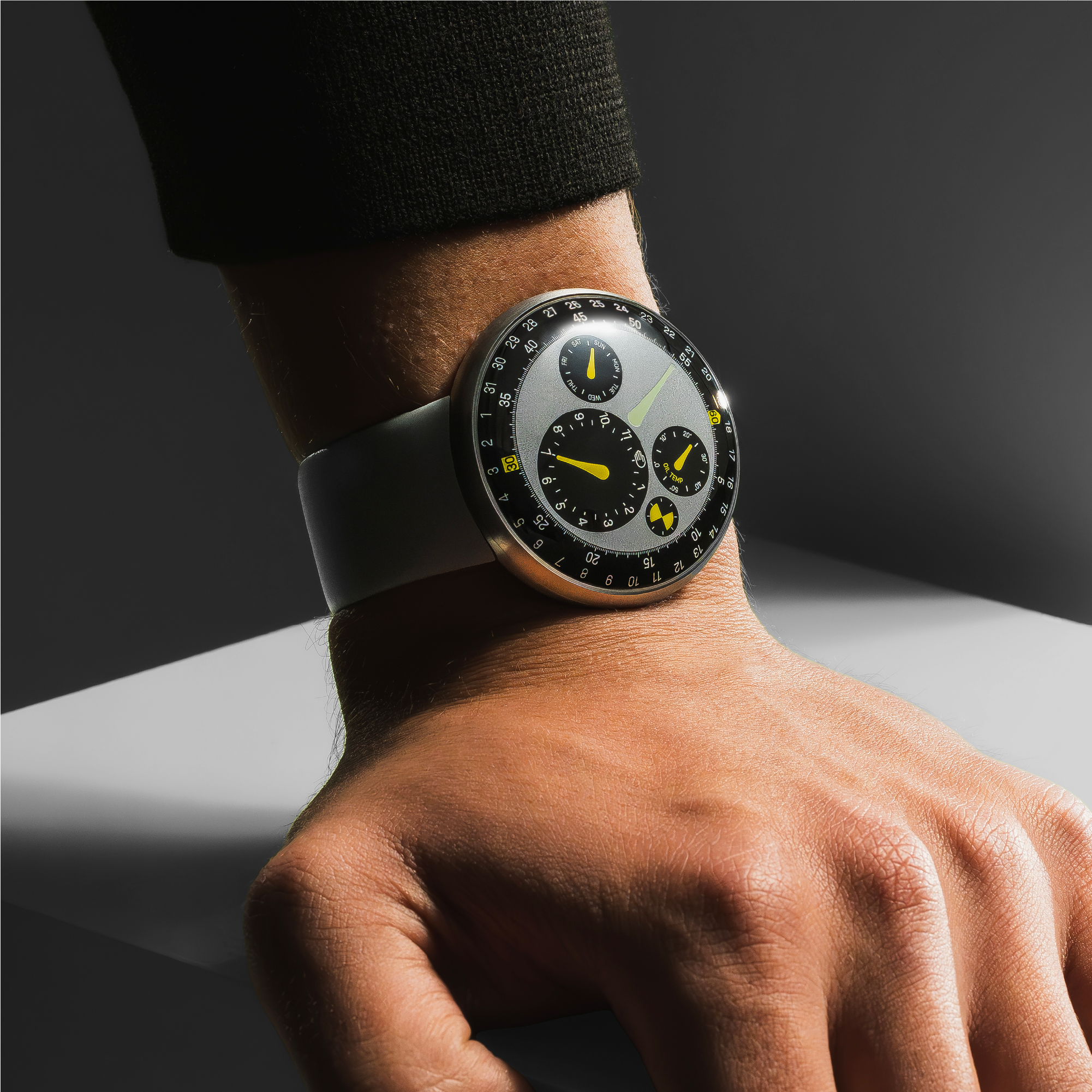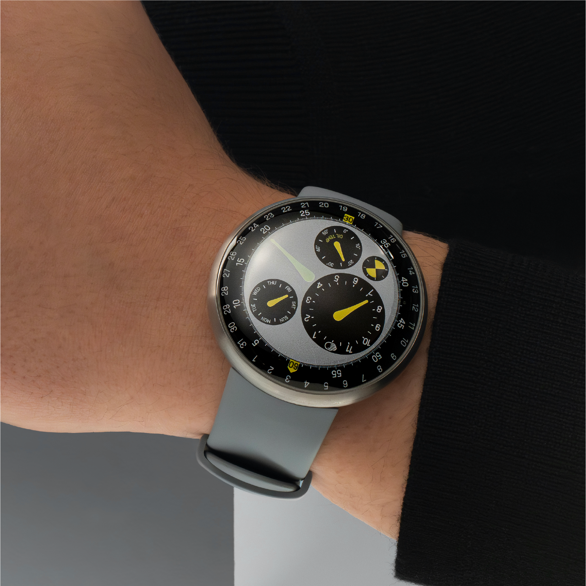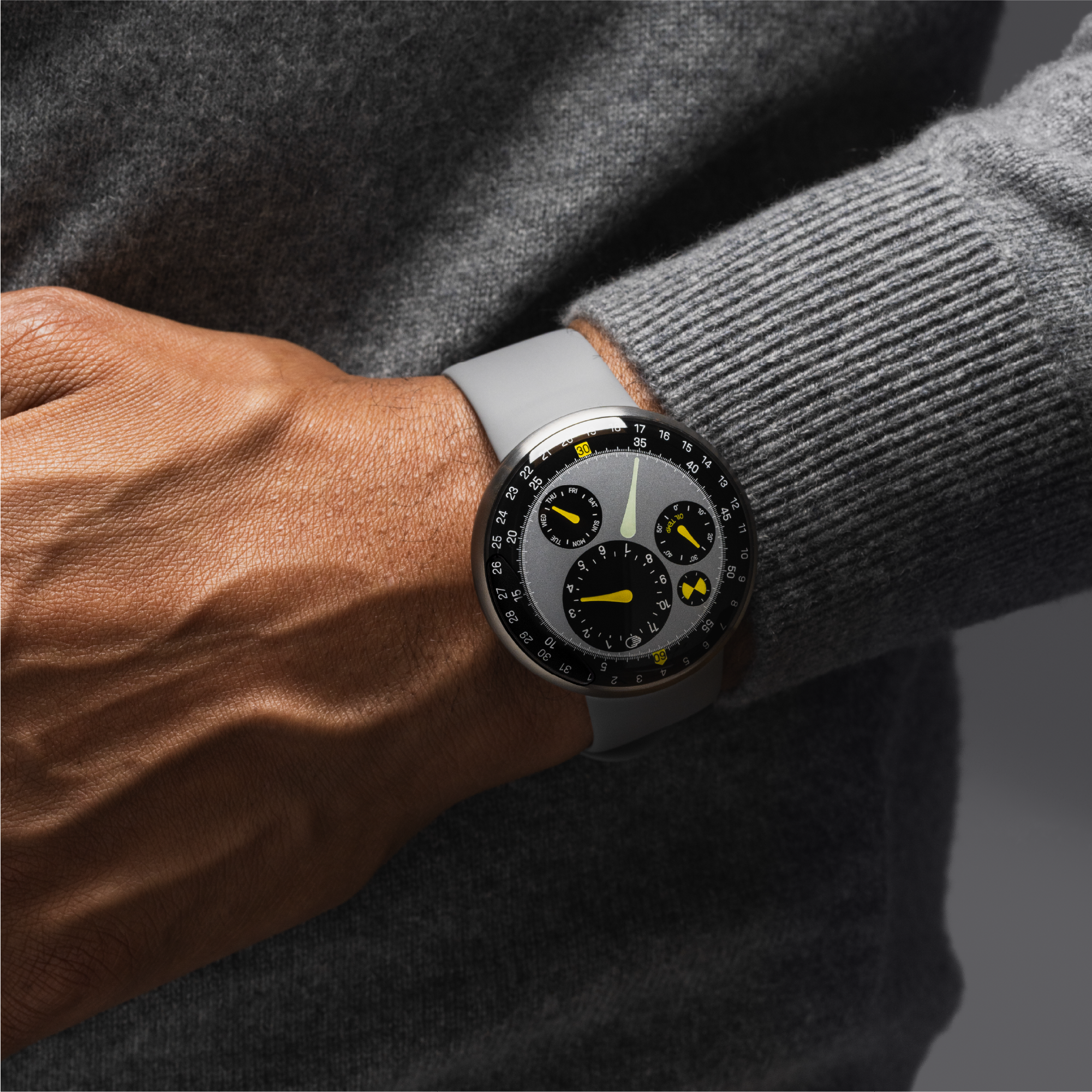 The aesthetic is playful yet precise. Minimal, expressive hands recall Newson’s Ikepod era, while a celadon-green and grey palette adds clarity and softness. Grade 5 titanium discs rotate across four eccentric satellites, with engraved markings filled in Super-LumiNova® for day-and-night readability.