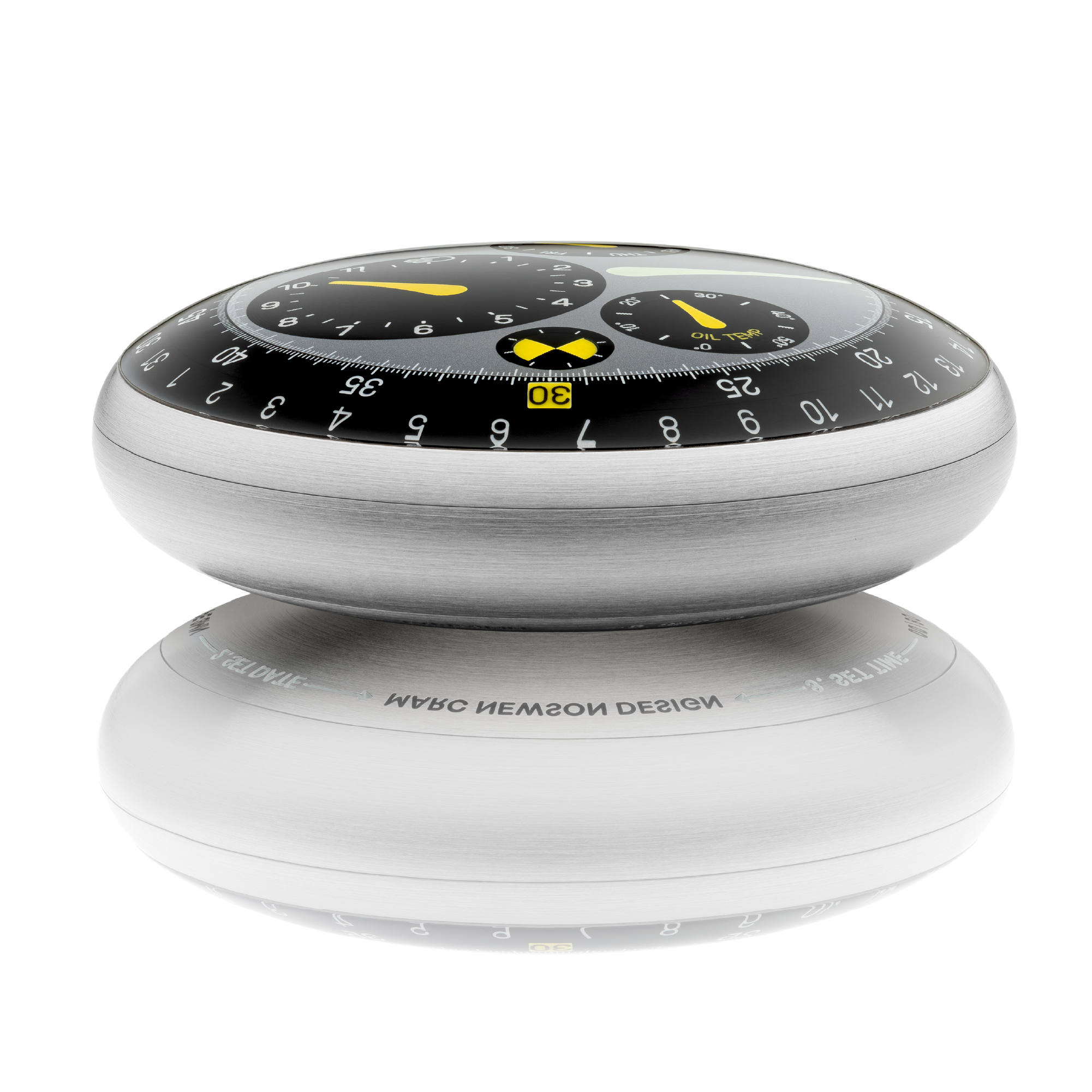 The silhouette is unmistakably Newson: a smooth, ergonomic, elliptical form with a seamless domed sapphire crystal. Inside, everything is pure Ressence—an oil-filled dial that removes optical distortion, a display that floats beneath the glass, and the patented ROCS 3 system that replaces hands with orbital discs.
