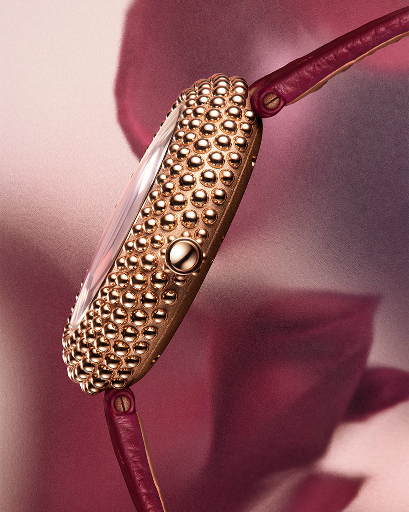 Inspired by the sea urchin — oursin in French — the case embodies contrast: soft curves against tactile geometry, light against shadow, elegance against rebellion. Its rounded titanium body is meticulously set with 234 individually placed gold beads, creating a hypnotic play of texture that blurs the line between jewellery and timekeeping.