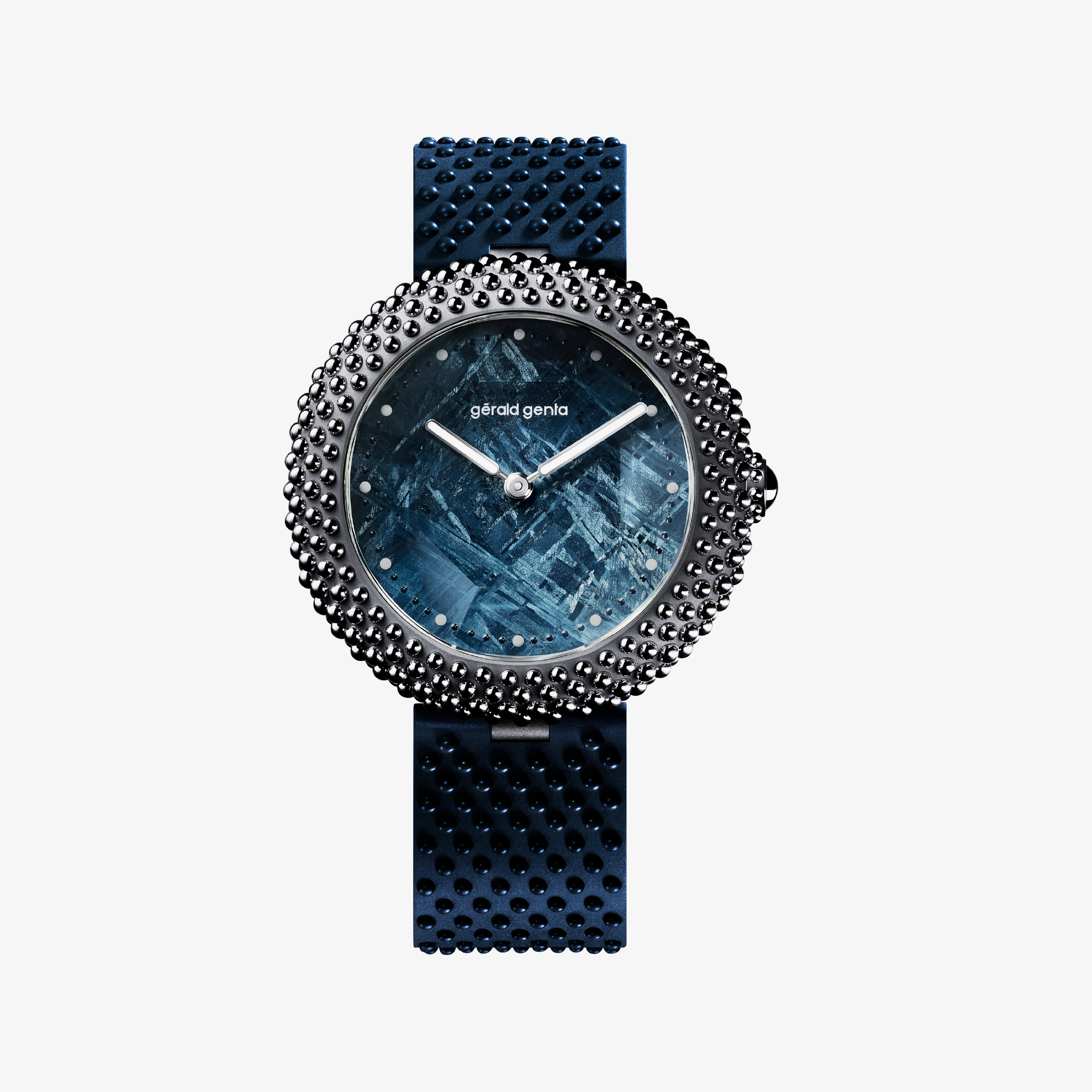 A sandblasted Grade 5 titanium case anchors the design — light on the wrist yet unmistakably architectural — encircled by 234 individually fitted white-gold beads that turn the watch into a miniature wearable sculpture. Inside this structure lies the star of the piece: a deep blue meteorite dial, alive with natural crystalline patterns that shift with the light. No two dials will ever share the same structure, ensuring every piece is a one-of-one.