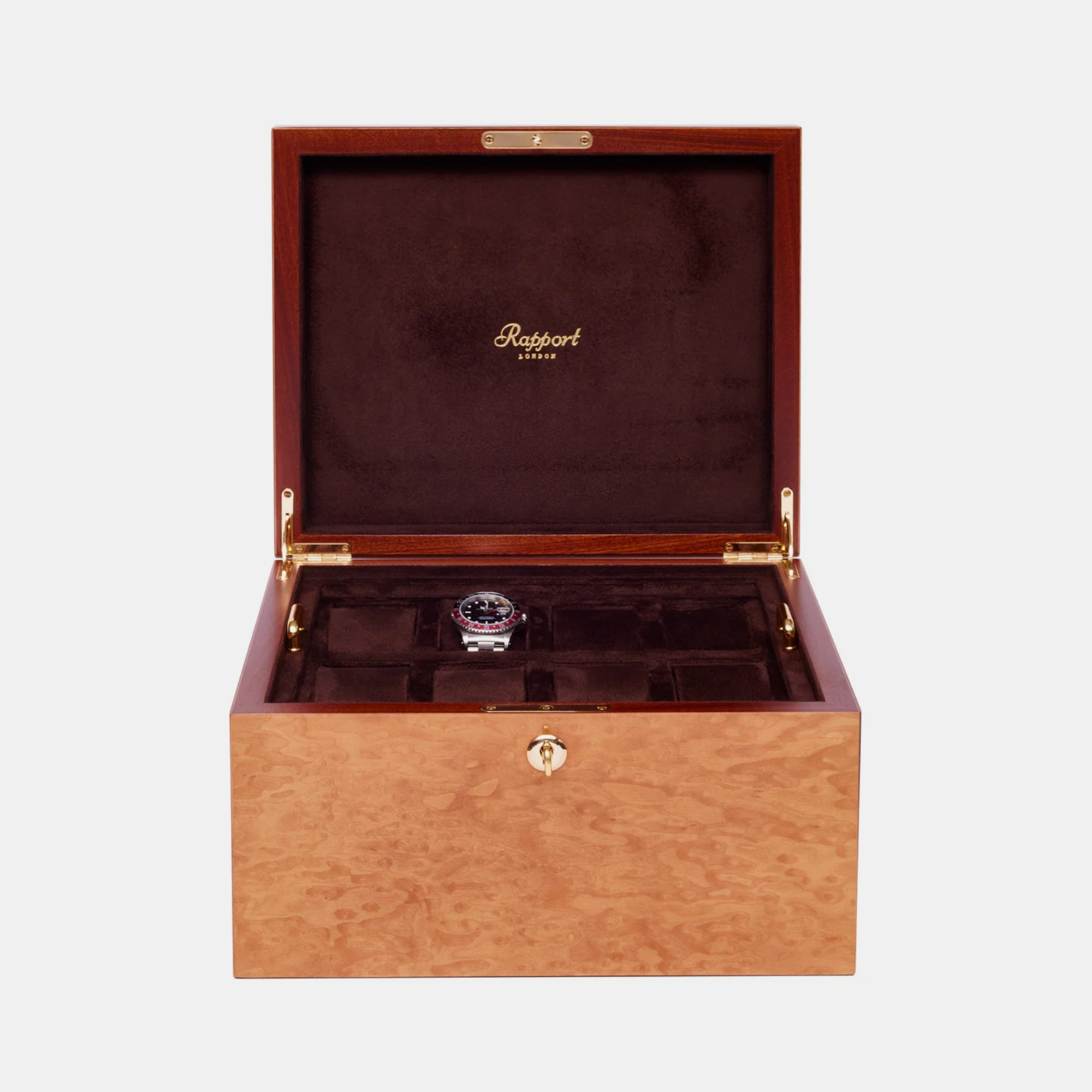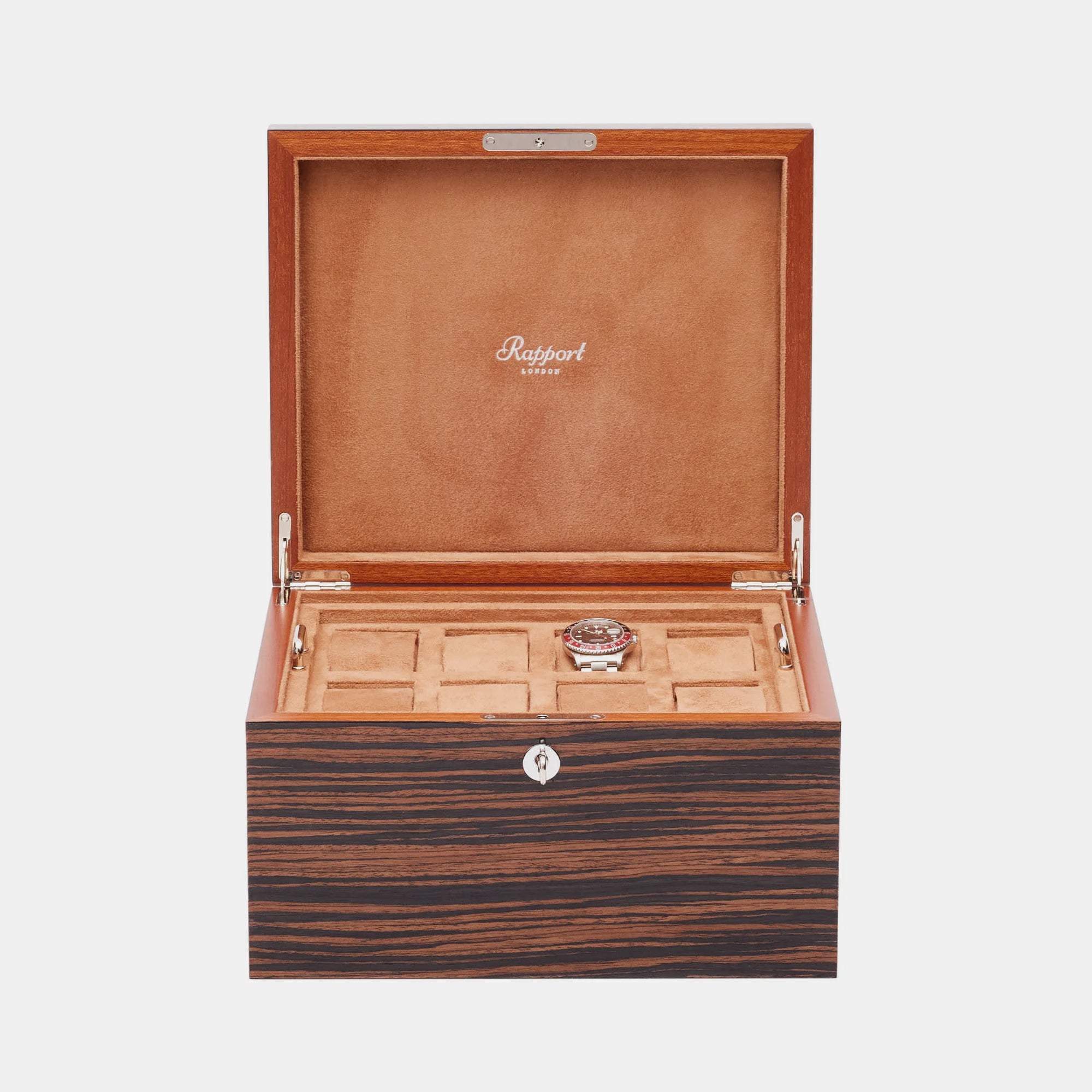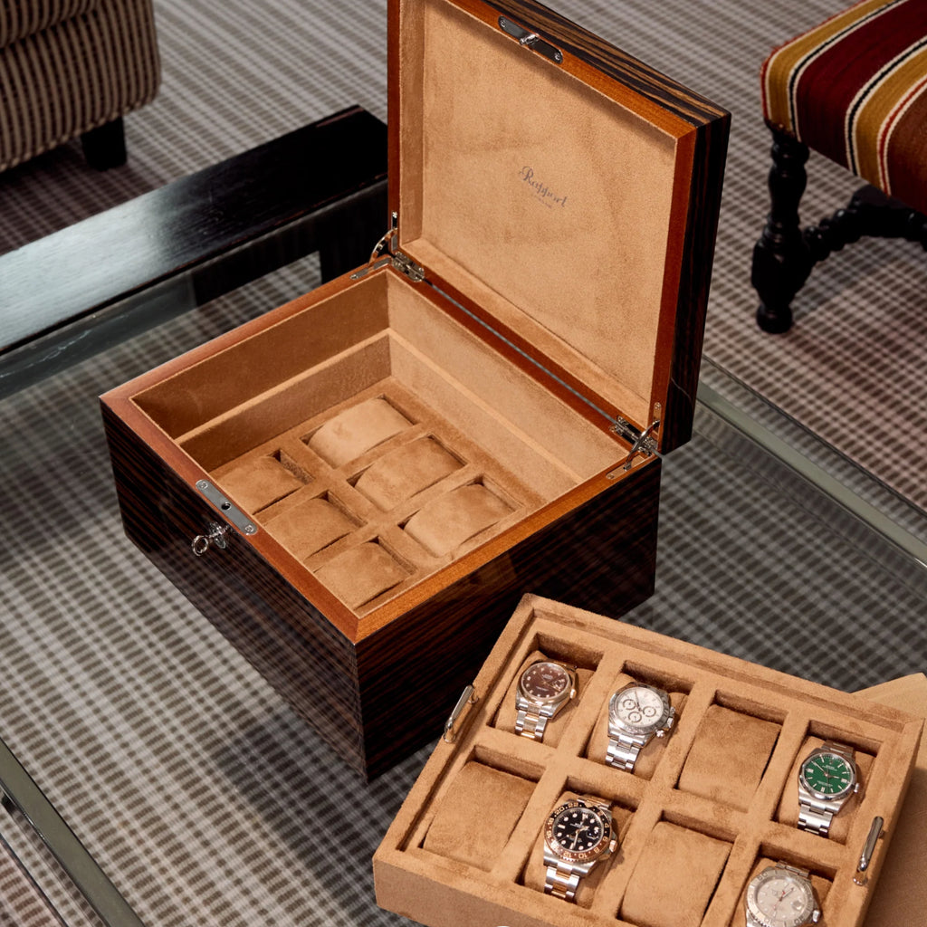 Each handcrafted watch box within the Heritage Collection pays homage to the 125 years of expert and quality craftsmanship. The Heritage Sixteen Watch Box safely houses your timepiece collection upon two trays of soft suede, adjustable cushions. The exterior has layers of hand applied lacquer to create exquisite finish.
