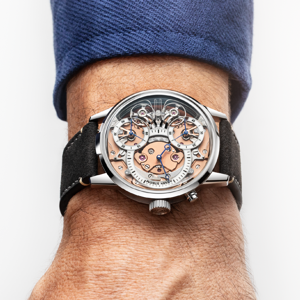 This latest interpretation envisions what a resonance wristwatch might have looked like if the phenomenon had been tamed in the age of marine chronometers — when consistent timekeeping could alter the course of navigation, exploration, and discovery. The result: a refined 43 mm stainless-steel case housing a movement that has finally conquered resonance fragility.