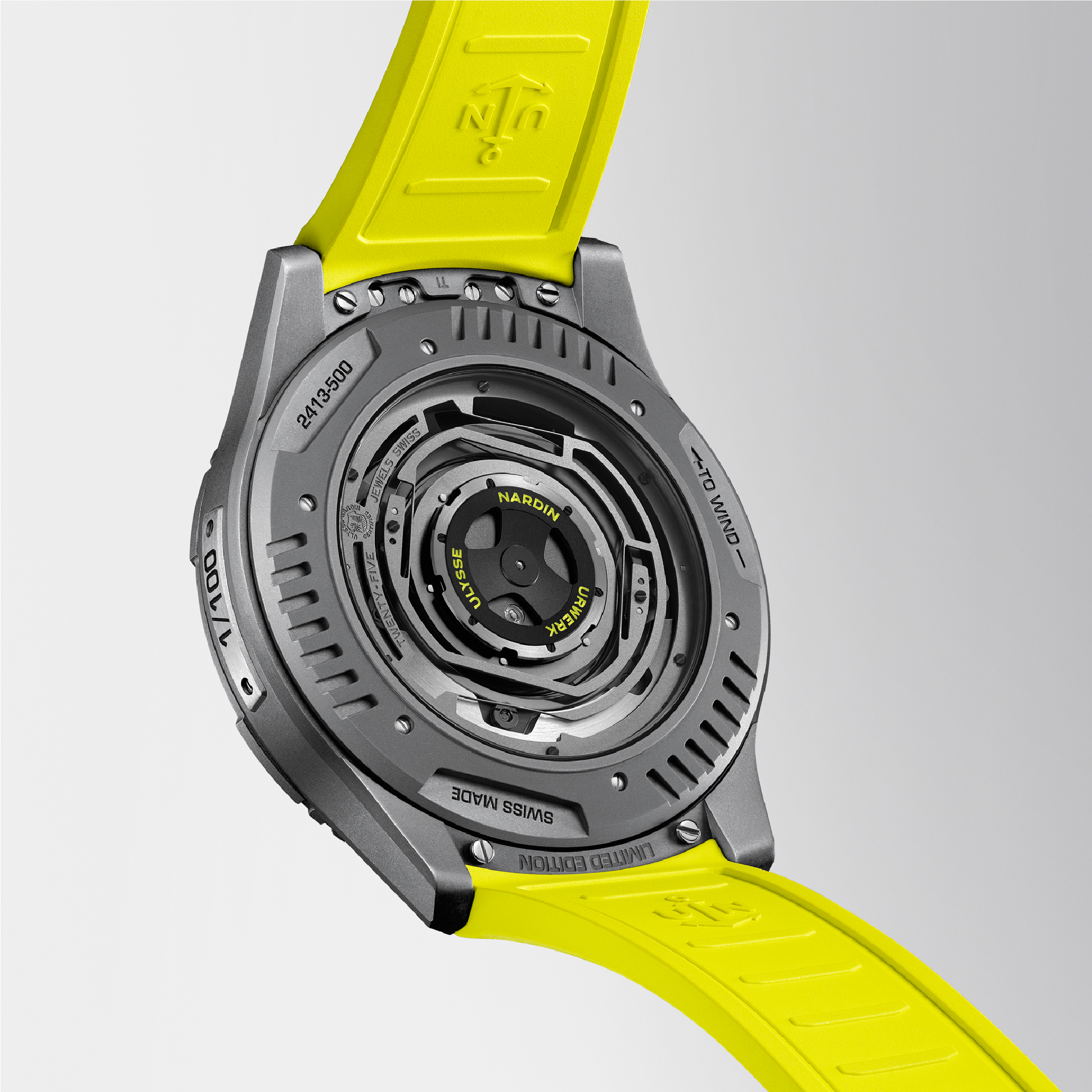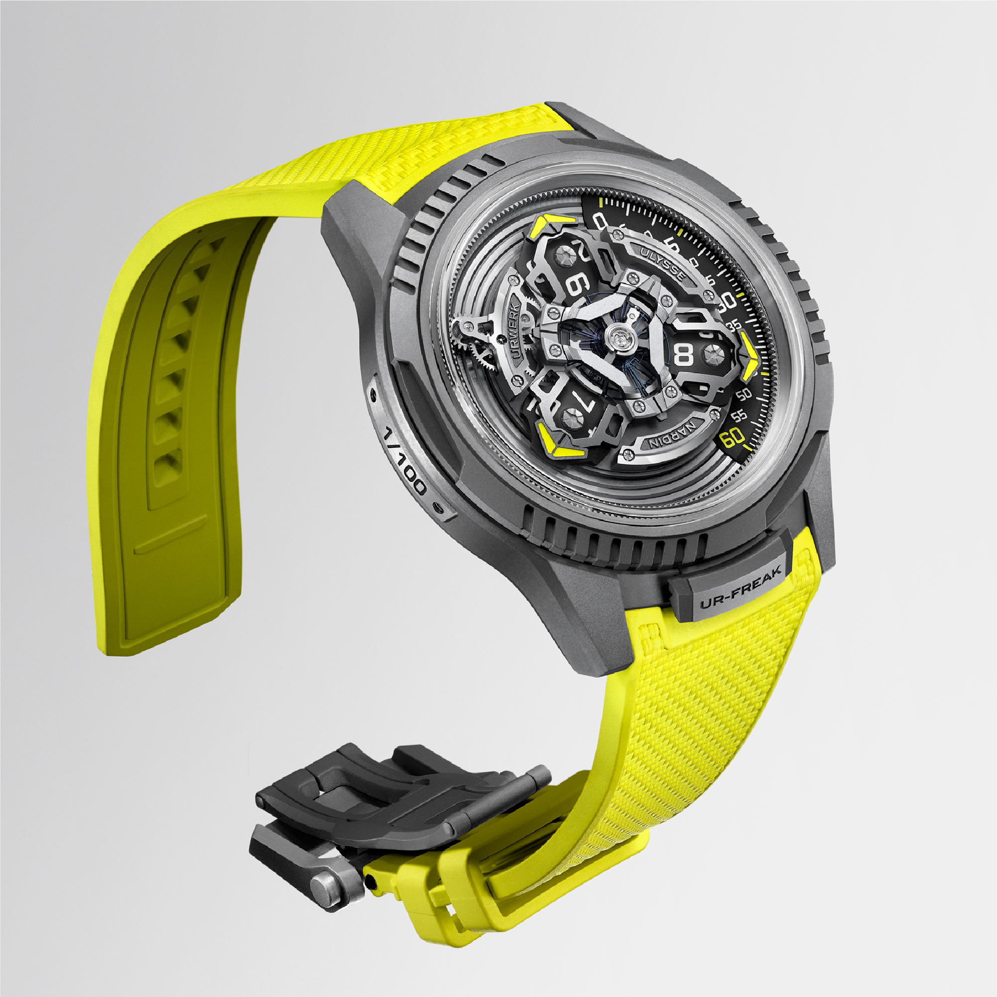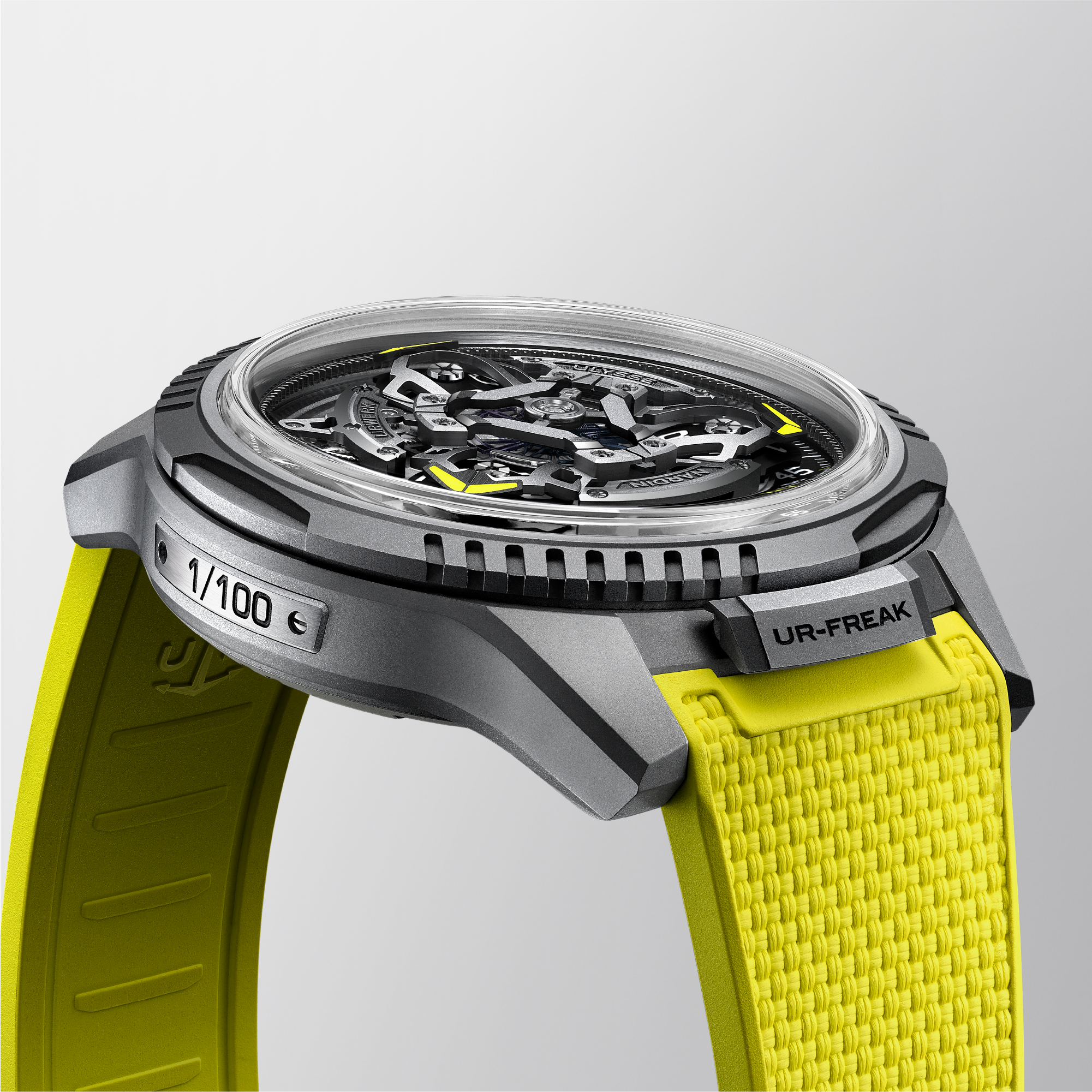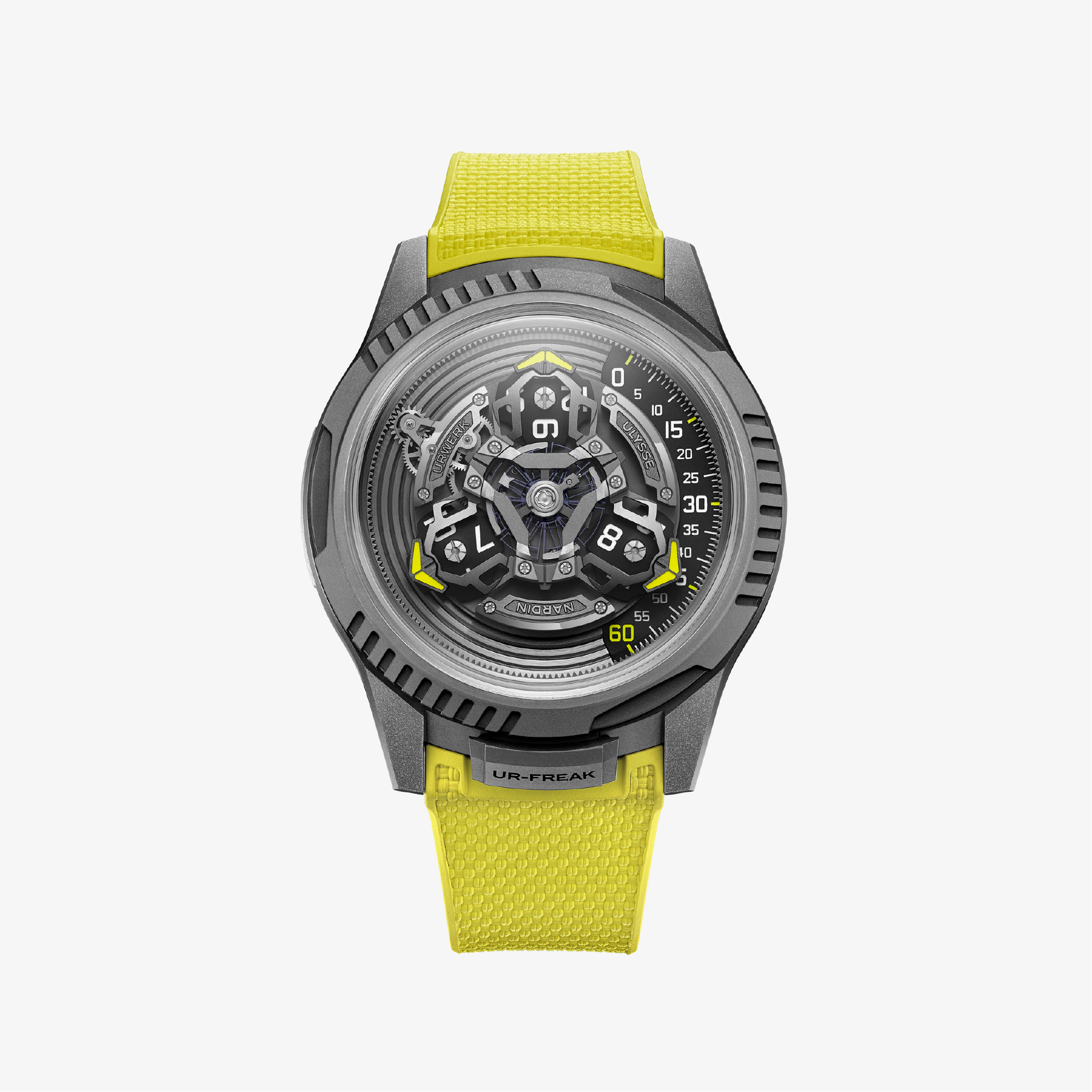 Inside the lightweight sandblasted titanium case, a central oversized silicon oscillator takes center stage, supported by a DIAMonSIL escapement and Ulysse Nardin’s Grinder® automatic system, one of the most efficient winding mechanisms in the industry. The result: a 90-hour reserve and a display that feels alive on the wrist. Finished with a neon yellow rubber strap, the UR-1 is limited to 100 pieces worldwide—a modern mechanical lightning strike.