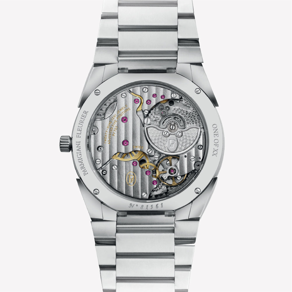 The Tonda PF Micro-Rotor measures 40 mm in diameter and owes its pure aesthetic to the uncluttered, matte guilloché dial. It inaugurates a new version of Parmigiani Fleurier's fundamental movement, the PF703.