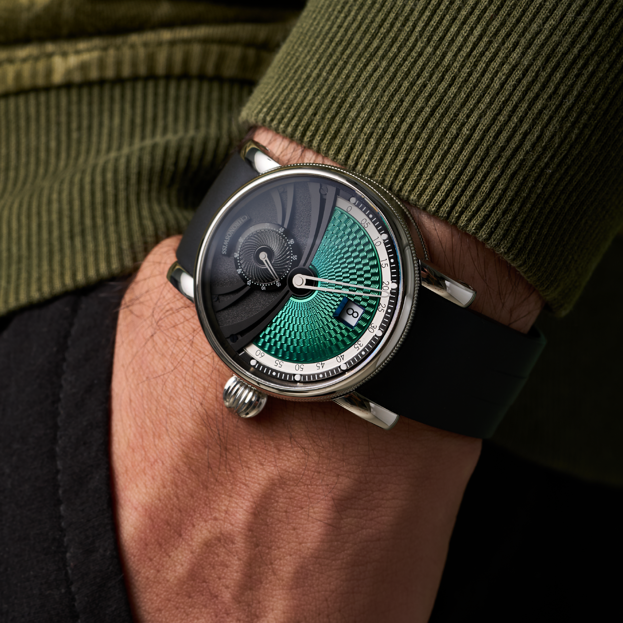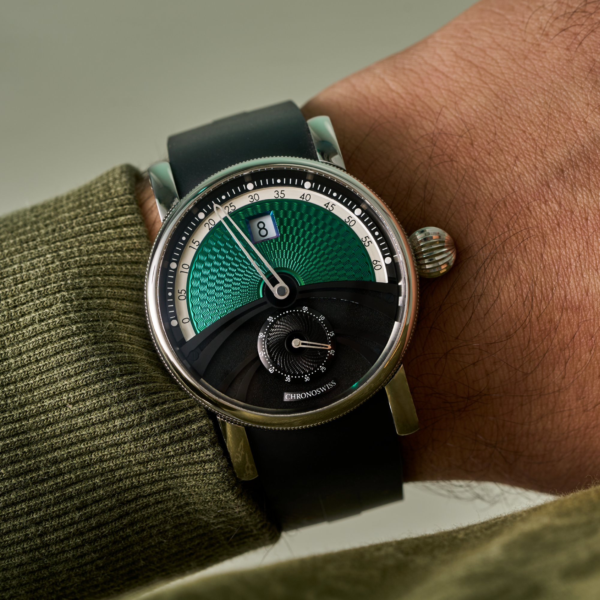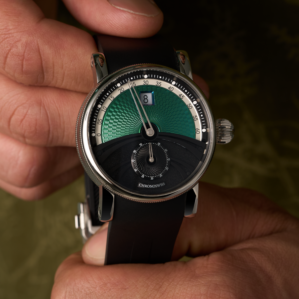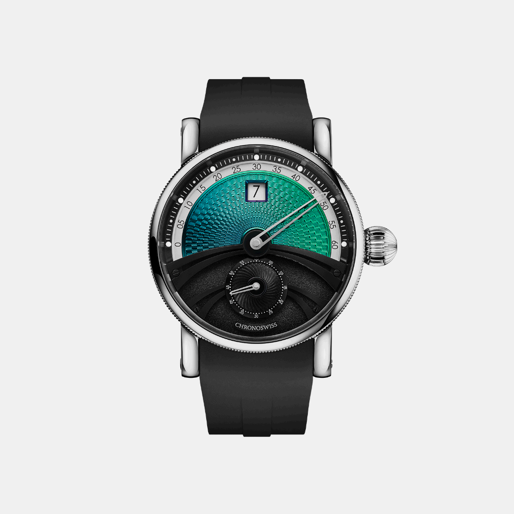 The Delphis Paraiba introduces steel to the Delphis family with a domed, color-shifting hand-guilloché dial inspired by Paraiba tourmalines. Its 42 mm steel case houses Chronoswiss’s C.6004 regulator caliber with jumping hours, retrograde minutes, and a UFO-style seconds at 6 o’clock. Limited to 50 pieces, it’s a vivid testament to craftsmanship and individuality.