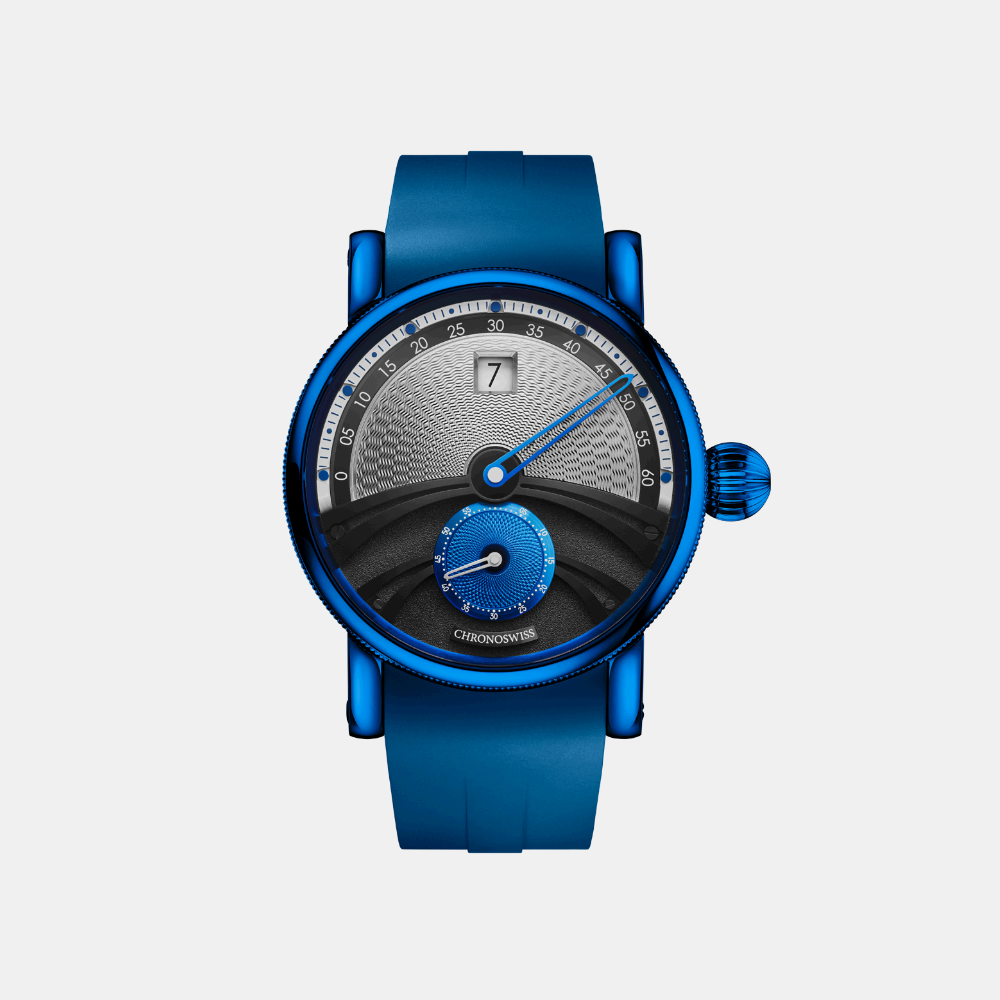 42 mm blue CVD steel regulator with guilloché dial, jumping hours, retrograde minutes, and 55 h automatic movement.