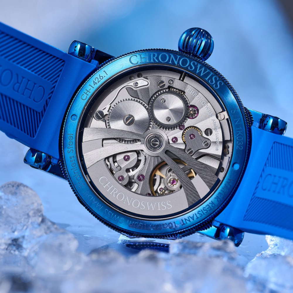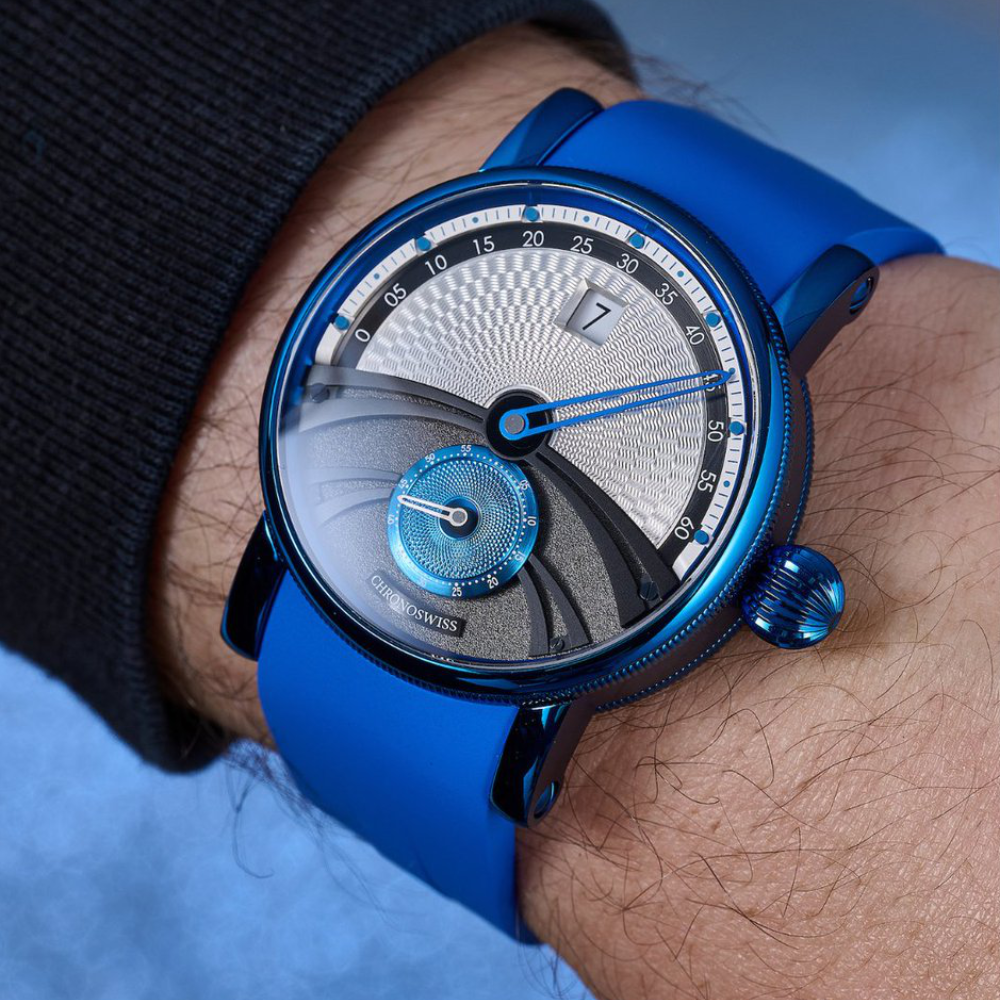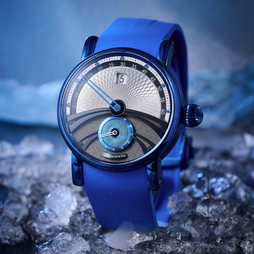 The Delphis Sub Zero channels the chill of eternal ice with a blue CVD-coated steel case and curved hand-guilloché dial. Its Manufacture C.6004 caliber powers jumping hours, retrograde minutes, and a small seconds at 6 o’clock, all framed by domed sapphire crystal. Fitted on a matching blue rubber strap, this 42 mm regulator delivers 55 hours of precision in a bold, frosted aesthetic.