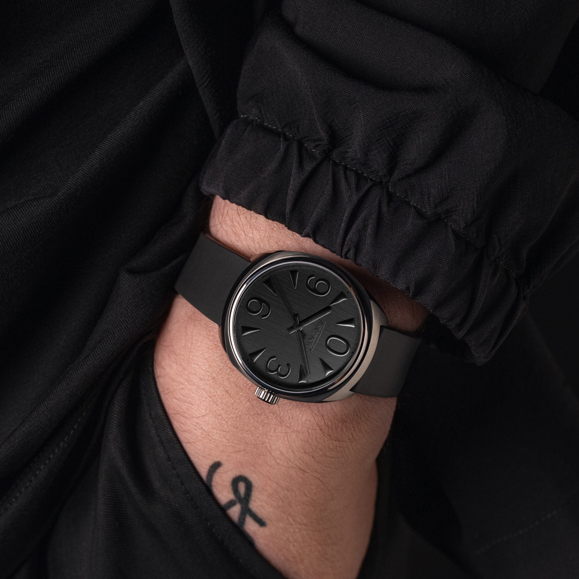 True to the strict minimalist design, oversized numerals, and the iconic large zero, Artemy Lebedev has added contemporary flair: a black-on-black scheme, matte convex markers and dial, matte hands, and a tinted back glass revealing the Studio's logo on a black rotor.