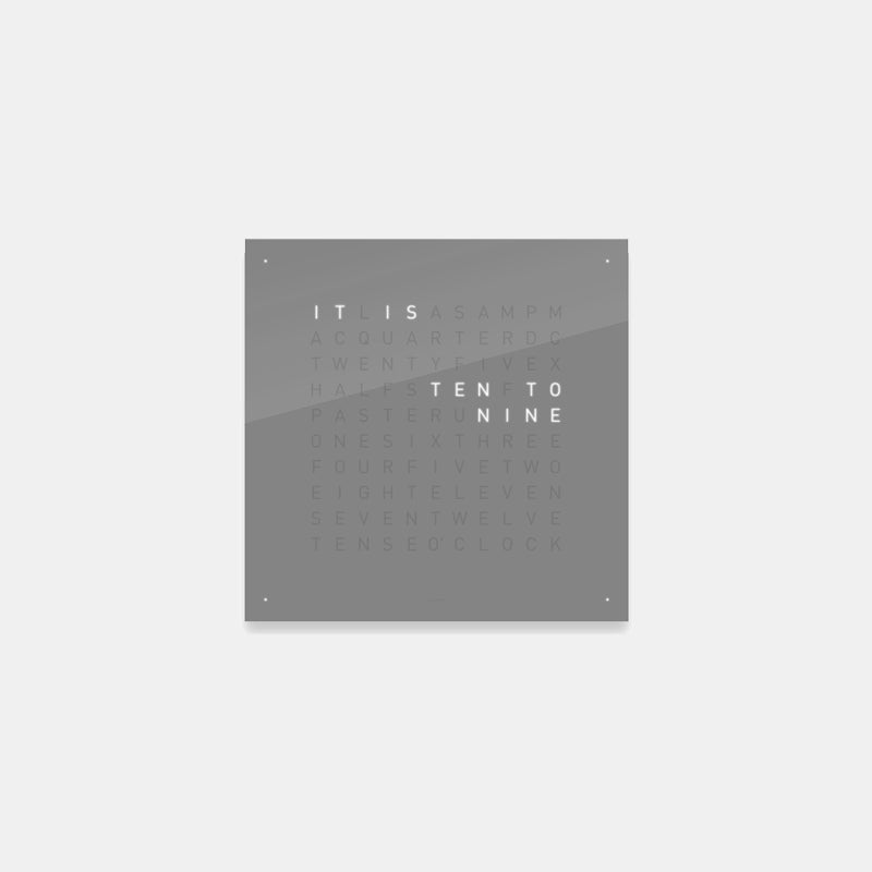 QLOCKTWO CLASSIC with interchangeable front cover GREY PEPPER made of grey, matt powder-coated stainless steel.