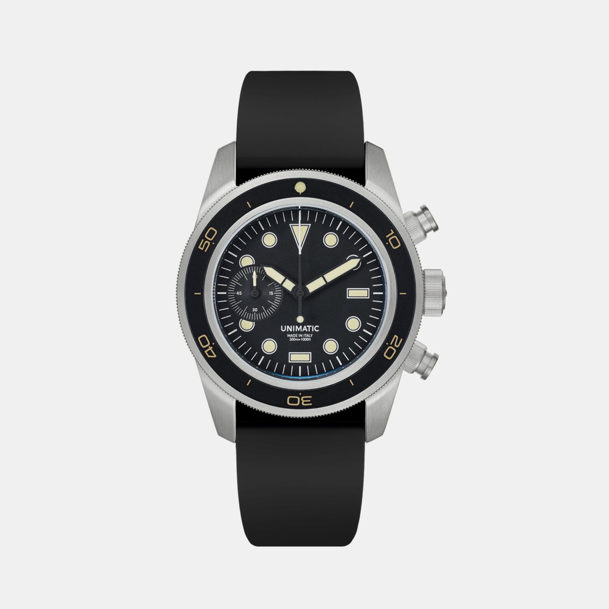 Timing accuracy is guaranteed by the VK64 meca-quartz movement tuned to 32,768 Hz for 3 years battery life, with 1/5 of a second indication plus 60 minutes counter. Comes on a matte black tapered quick-release two-piece TPU strap with stainless steel brushed hardware signed UNIMATIC.