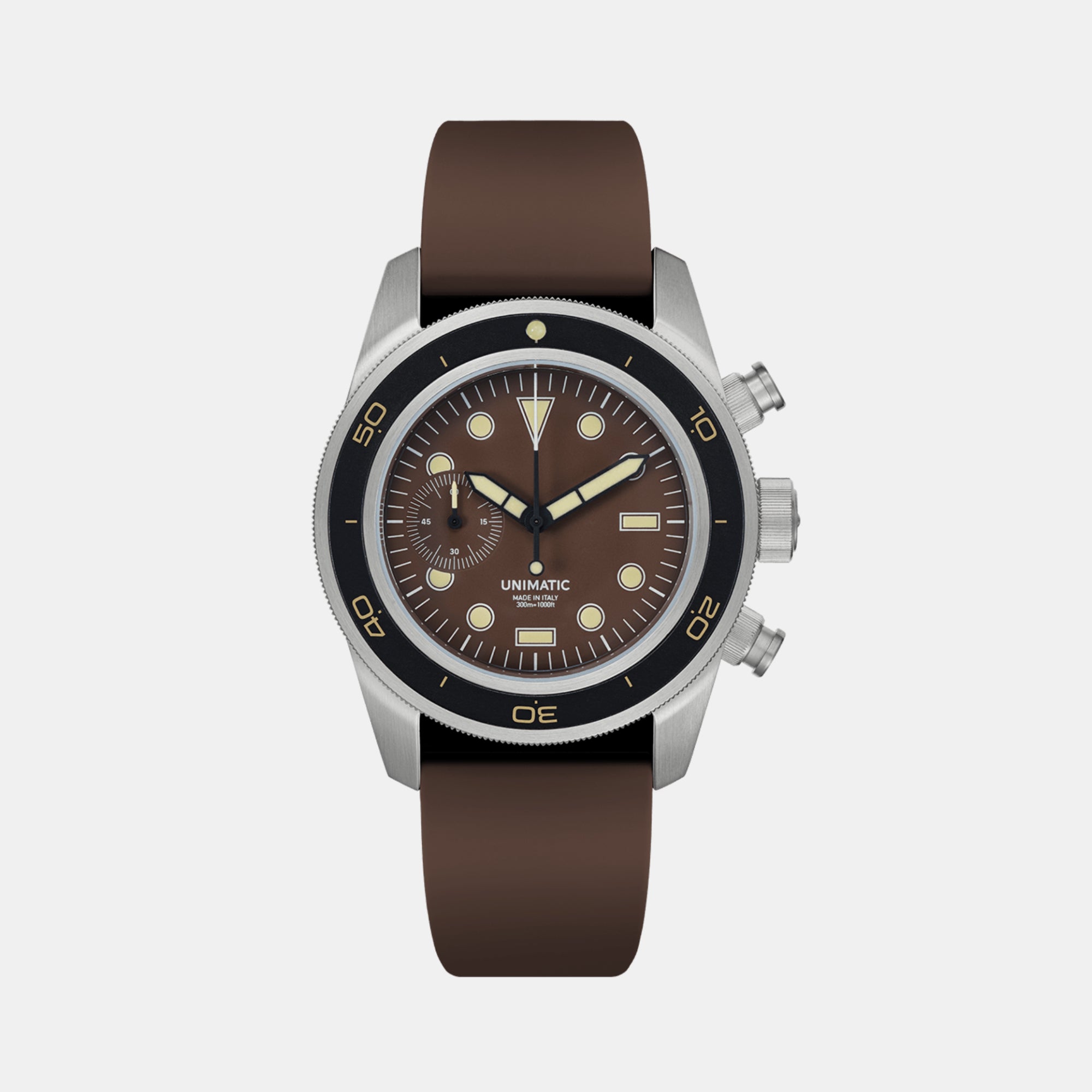 Timing accuracy is guaranteed by the VK64 meca-quartz movement tuned to 32,768 Hz for 3 years battery life, with 1/5 of a second indication plus 60 minutes counter. Comes on a tropic brown tapered quick-release two-piece TPU strap with stainless steel brushed hardware signed UNIMATIC.