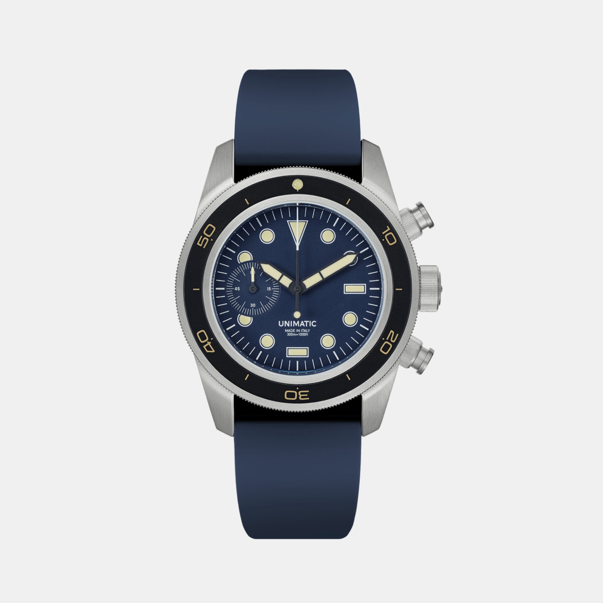 Timing accuracy is guaranteed by the VK64 meca-quartz movement tuned to 32,768 Hz for 3 years battery life, with 1/5 of a second indication plus 60 minutes counter. Comes on a vintage navy tapered quick-release two-piece TPU strap with stainless steel brushed hardware signed UNIMATIC.