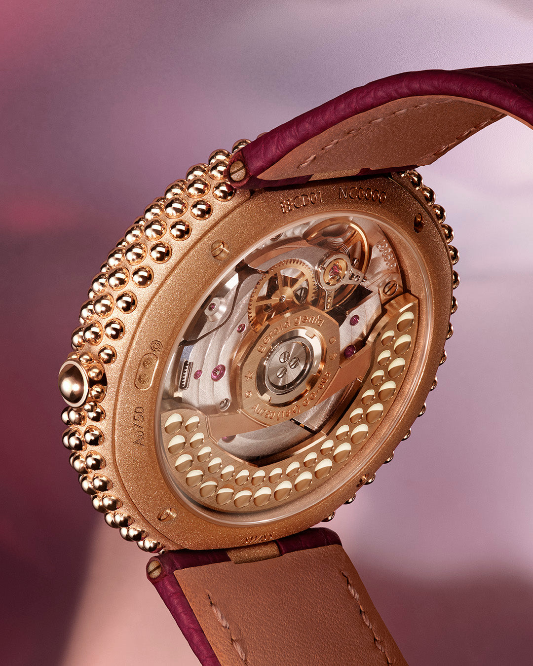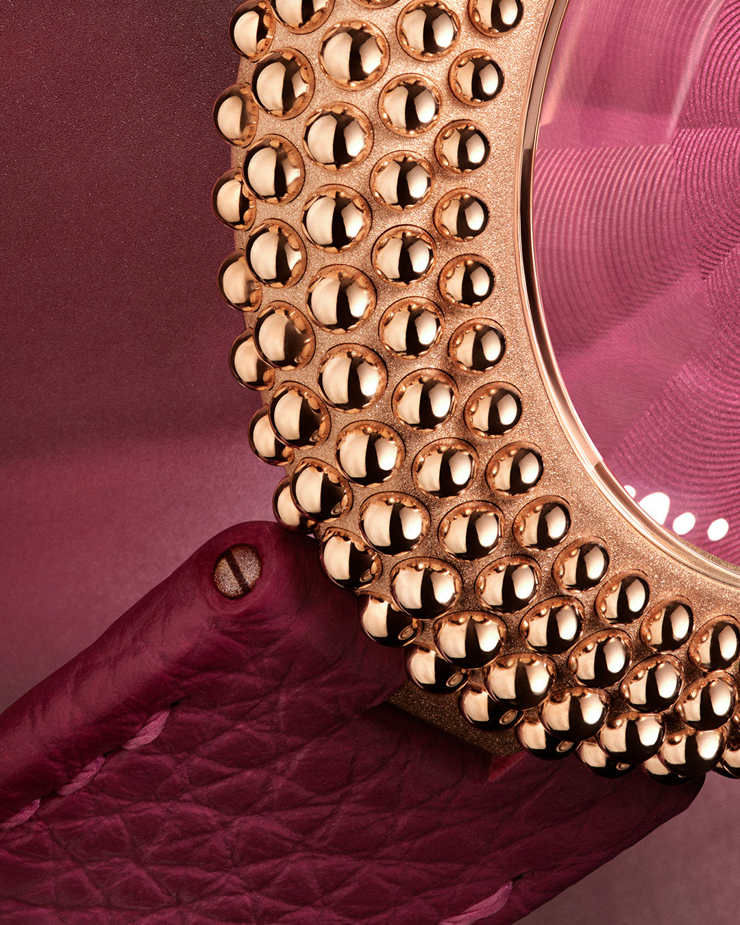 Inspired by the sea urchin — oursin in French — the case embodies contrast: soft curves against tactile geometry, light against shadow, elegance against rebellion. Its rounded titanium body is meticulously set with 234 individually placed gold beads, creating a hypnotic play of texture that blurs the line between jewellery and timekeeping.