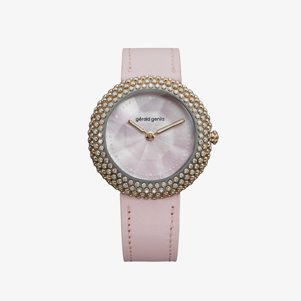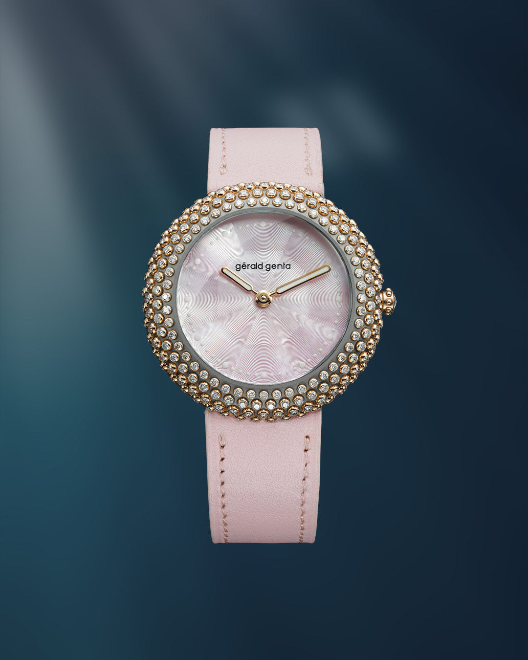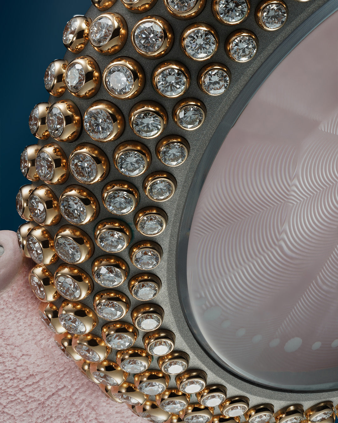 Softness meets spectacle in the Gentissima Oursin 36 Pink Mother of Pearl — a luminous composition of titanium, rose gold, and diamonds that transforms light into texture.