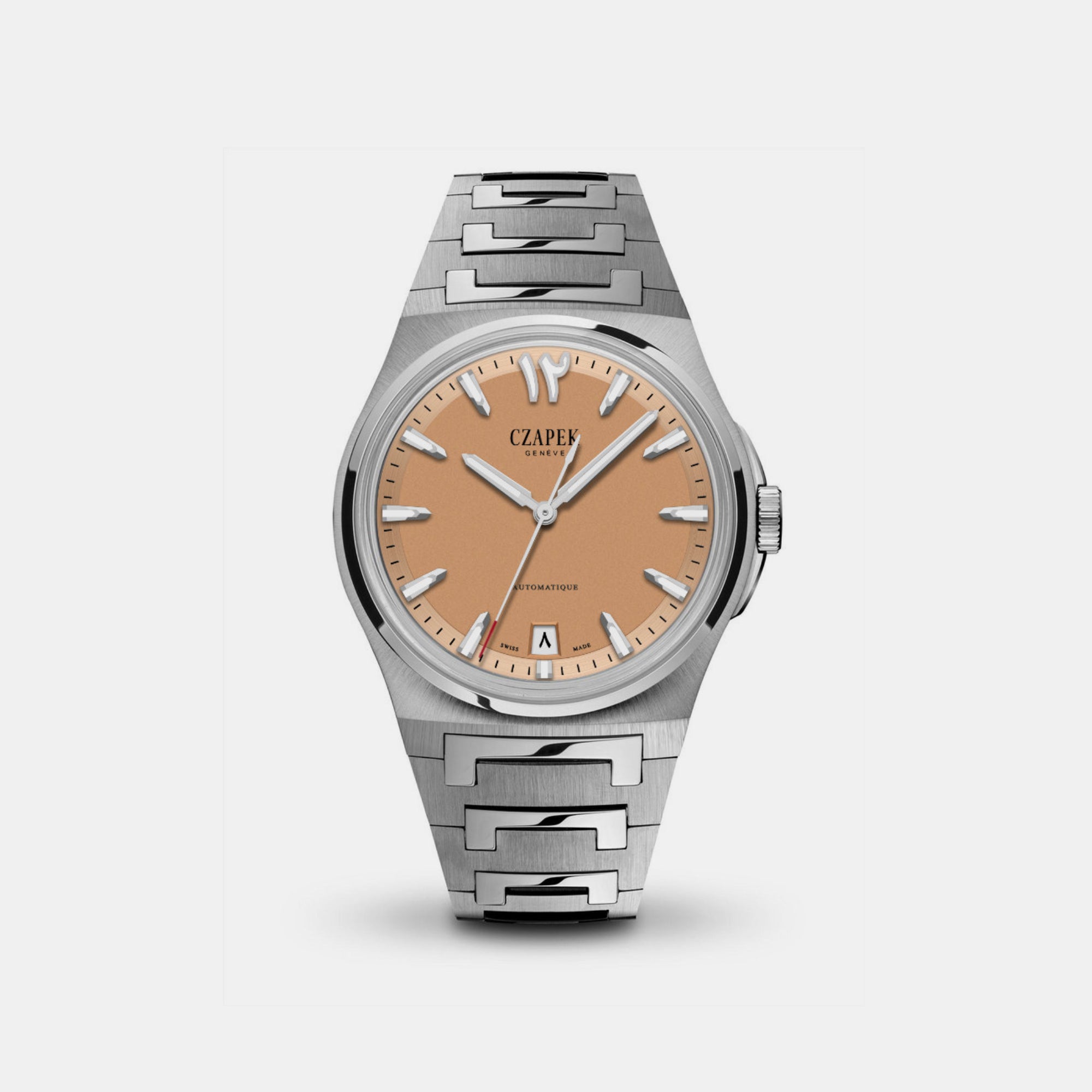 Every detail of the Antarctique Desert Rose has been thoughtfully crafted to elevate it beyond simple timekeeping, offering a refined and contemporary expression of Czapek’s watchmaking philosophy. The sand-tone dial, microblasted for a soft matte mineral texture, forms the backdrop for sharp sword-shaped hands and raised indexes that enhance depth, clarity, and visual balance. The 6 o’clock date window maintains Czapek’s signature vertical symmetry, pairing elegance with everyday practicality. Its 40.5mm case preserves the Antarctique line’s double trompe-l’œil curvature, delivering comfort and subtle tension. The integrated stainless steel bracelet, equipped with a micro-adjustment system and Czapek’s EasyRelease mechanism, allows effortless transitions to leather or rubber straps.