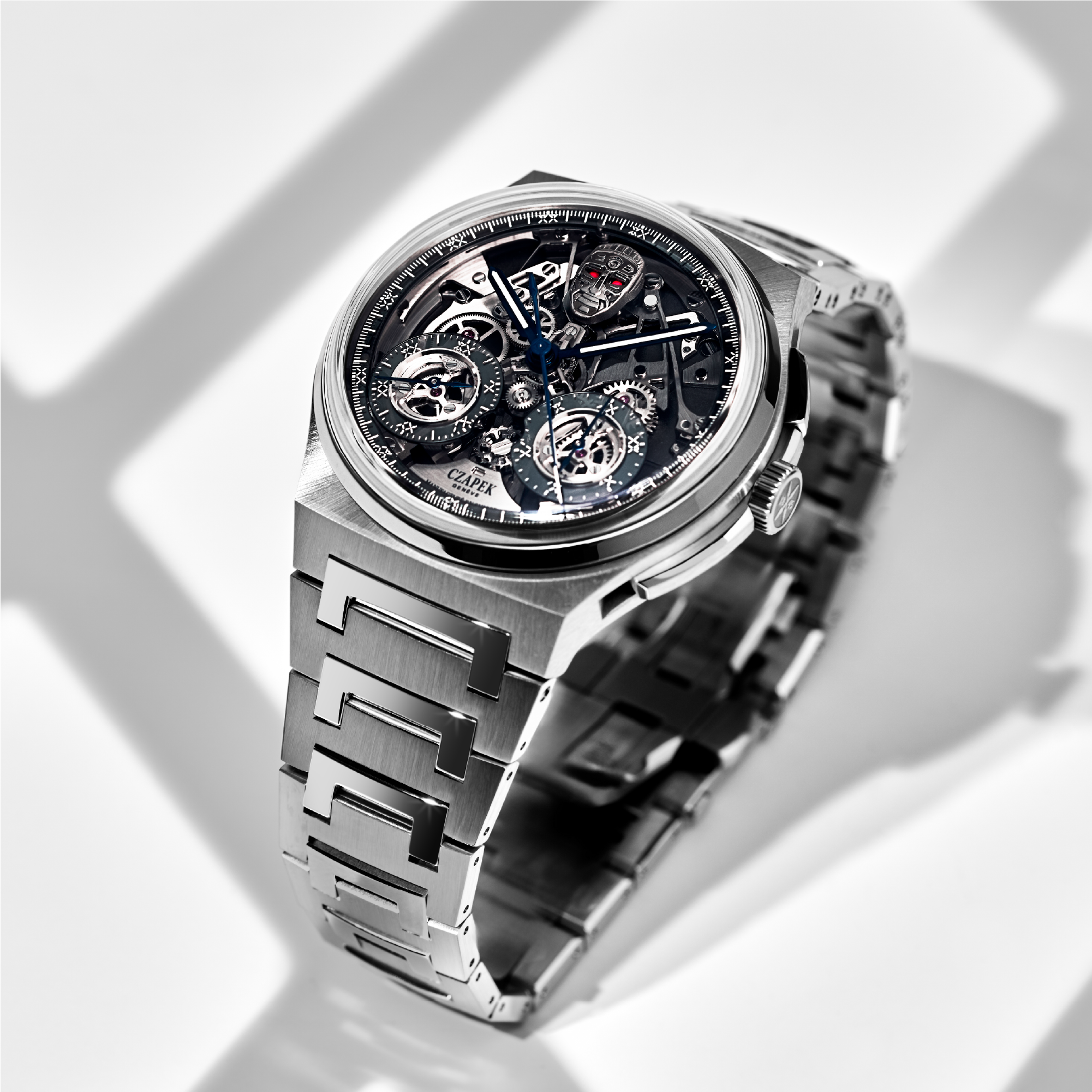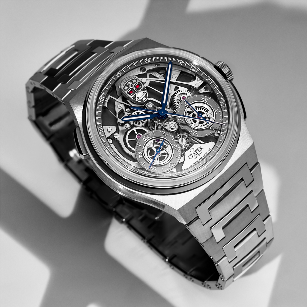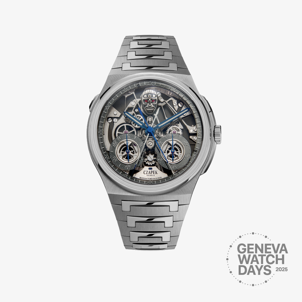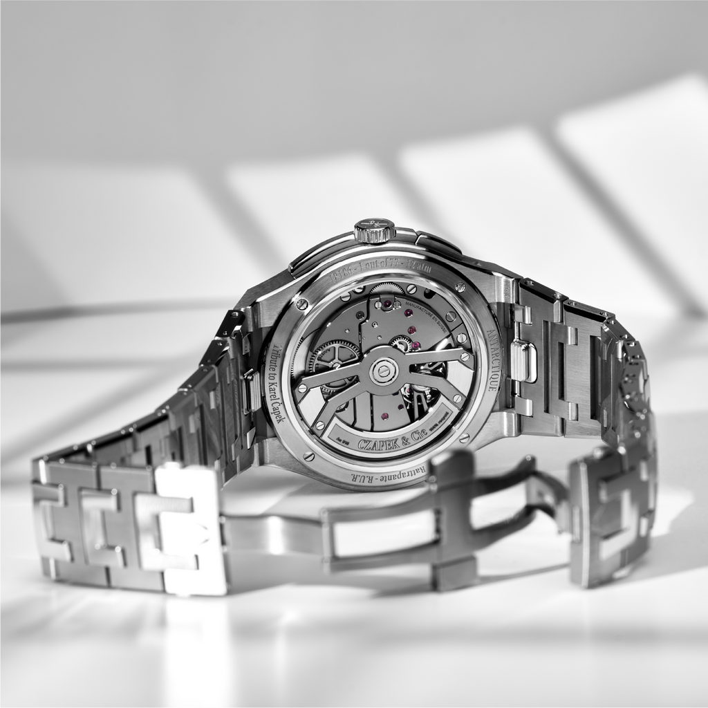The Antarctique Rattrapante R.U.R. is Czapek & Cie’s boldest take yet on its signature split-seconds chronograph. Beneath a grey-metallised sapphire dial, a titanium robot head — hand-polished, laser-engraved, and micro-painted — animates with every press of the chronograph pushers. Start, its eyes flash yellow. Stop, they burn red. Reset, they glow blue. A playful animation, hardwired into haute horlogerie.