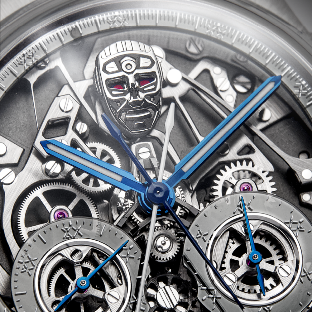 The dial is layered with futuristic details: a white chronograph hand, a blue aluminium rattrapante hand tipped in white, and robot-language “XX” markers inspired by Predator’s Yautja alphabet — a subtle nod to science fiction and Czapek’s own Xavier de Roquemaurel.