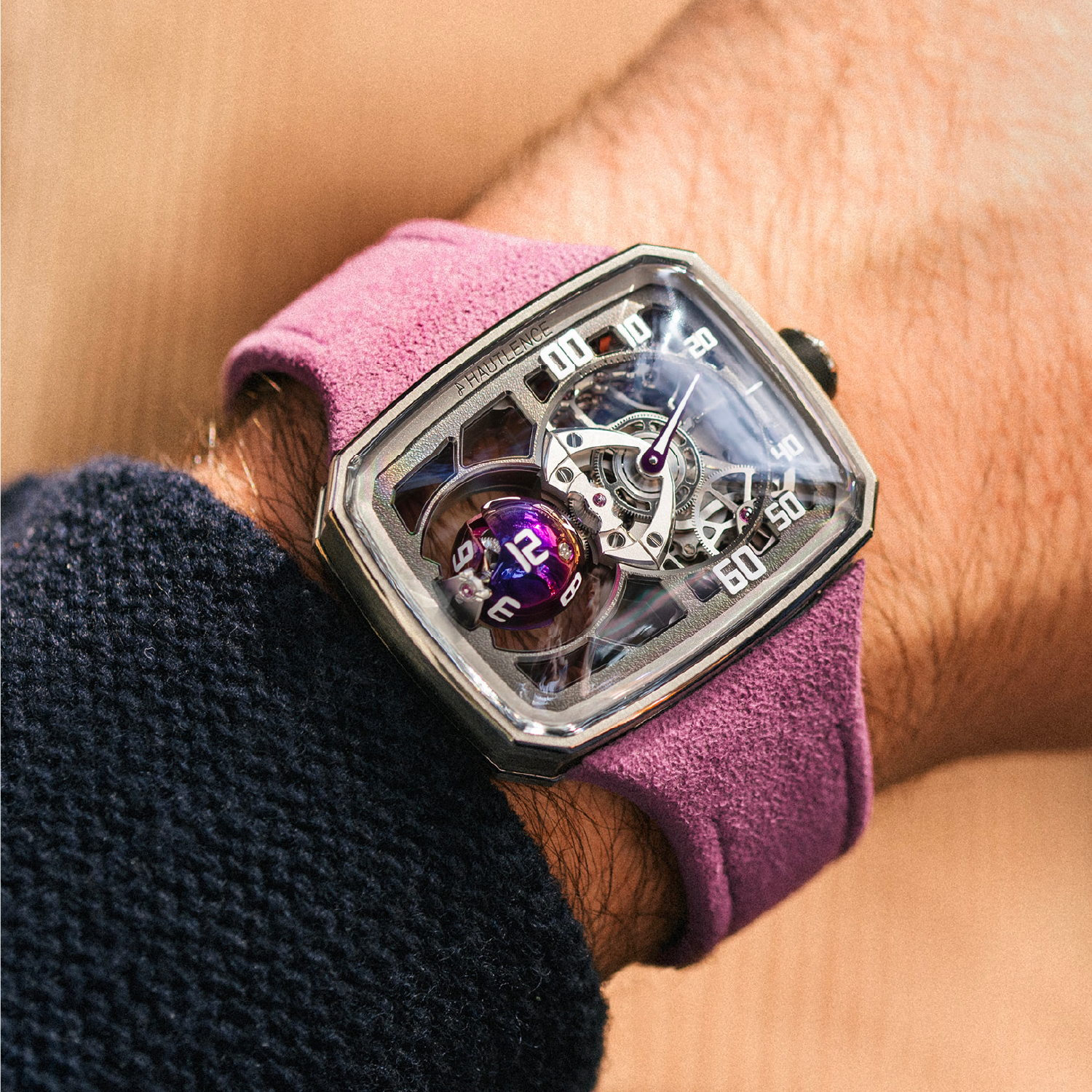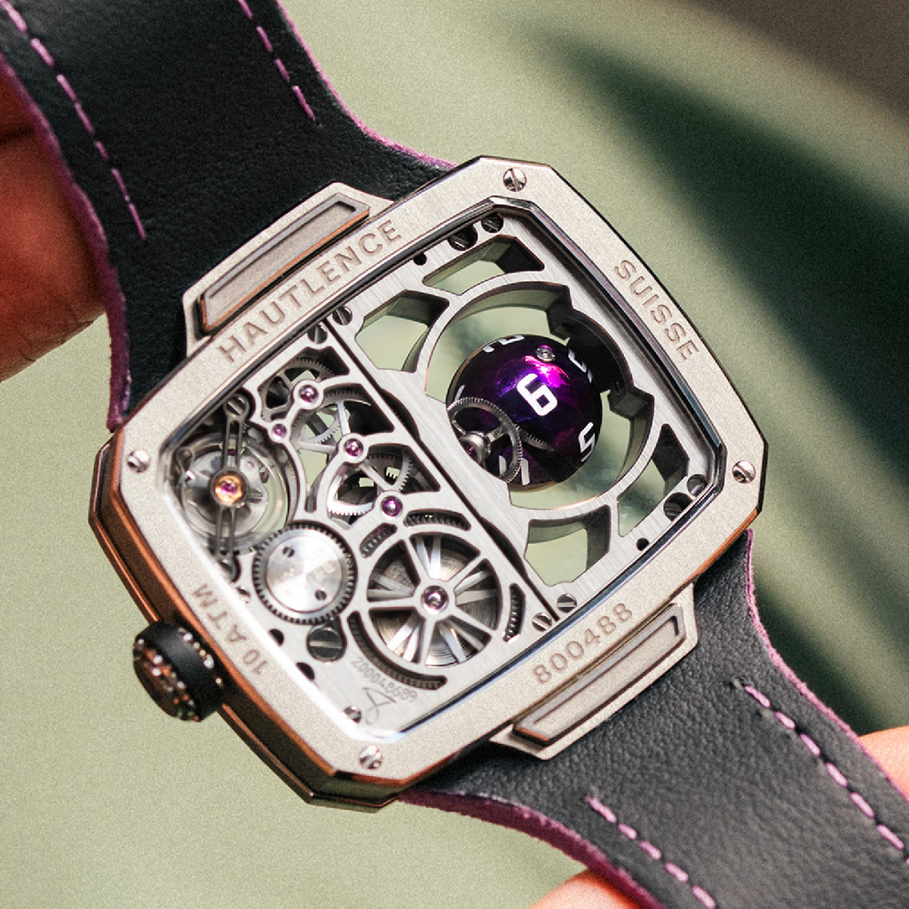 The new HAUTLENCE Sphere Series 3 refines one of the brand’s most hypnotic complications in a more compact, architectural form. The grade 5 titanium case now measures 37 × 45 mm, with sharper lines and a sculptural profile that balances presence with wearability. On the left of the skeletonised dial, the spherical hour display rotates on three axes, revealing numerals through a ballet of four conical gears. On the right, a retrograde minute hand in purple titanium sweeps across its arc before snapping back in perfect control.