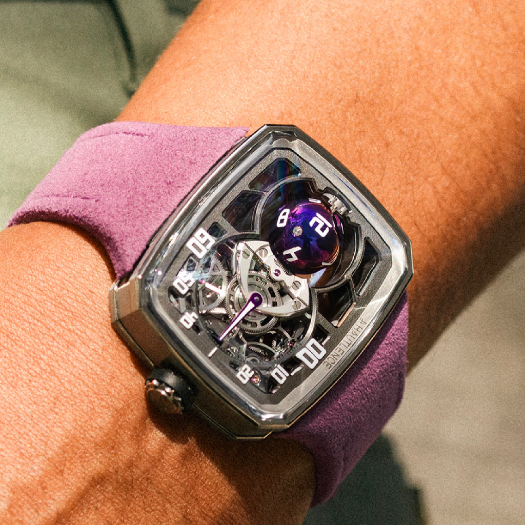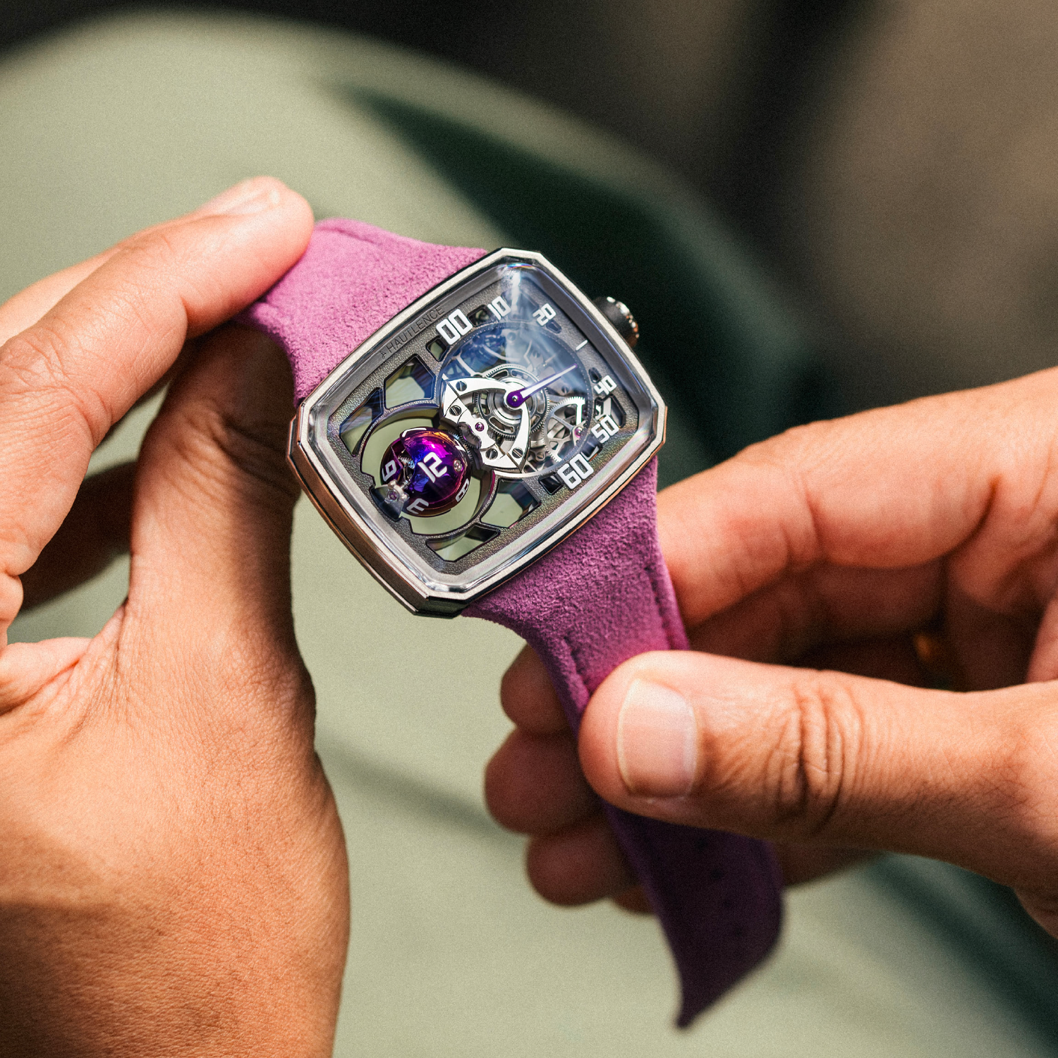 Beneath it all lies the hand-wound calibre A82, newly adapted to the smaller case and crafted in-house. The open barrel reveals the tension of the mainspring and its 72-hour reserve, while the movement’s geometry plays with light and depth like kinetic architecture. Purple accents, suede strap, and a view through sapphire — the Sphere Series 3 turns time into art.