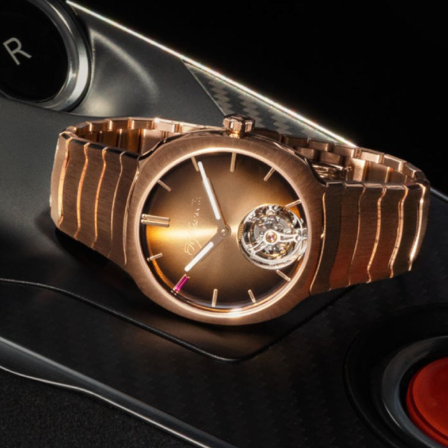 Its fully integrated red gold bracelet flows seamlessly from the case, sculpted with Moser’s signature organic lines for a continuous silhouette that balances sport and elegance. Limited to just 10 pieces worldwide, this is a collector’s piece that blends horological artistry with Gasly’s passion for detail.