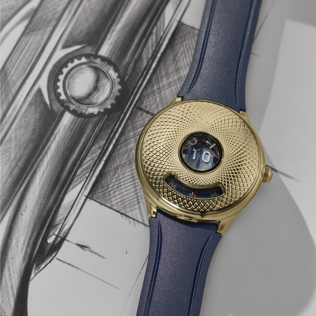 Hours are revealed through twin sapphire discs beneath the loupe-like central aperture, while trailing minutes orbit around a laser-textured blue ring.