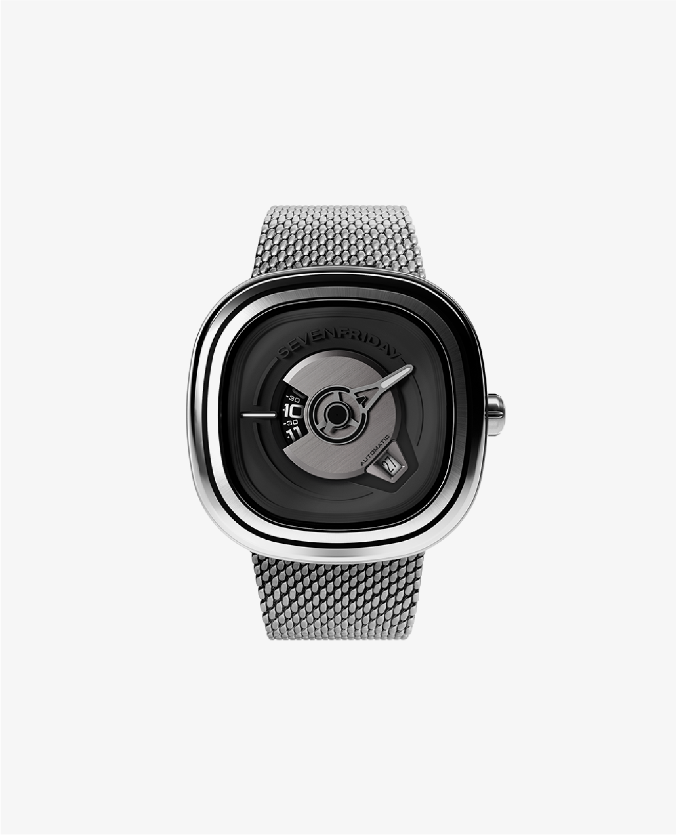 Here, brutalism meets aerodynamism in a design inspired by the raw aesthetics of industrial heritage, with dial elements that echo the familiar charm of rumbling classic speakers and the precision of a hard disk drive. The central disk, reminiscent of spinning digital memory, brings hypnotic movement to a clean, minimalistic dial—