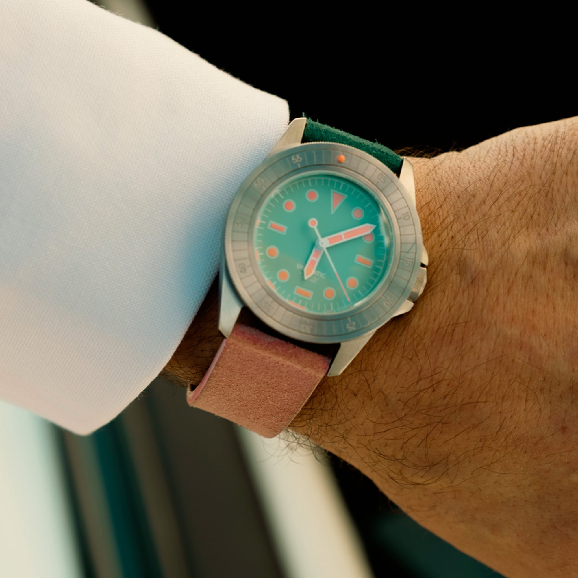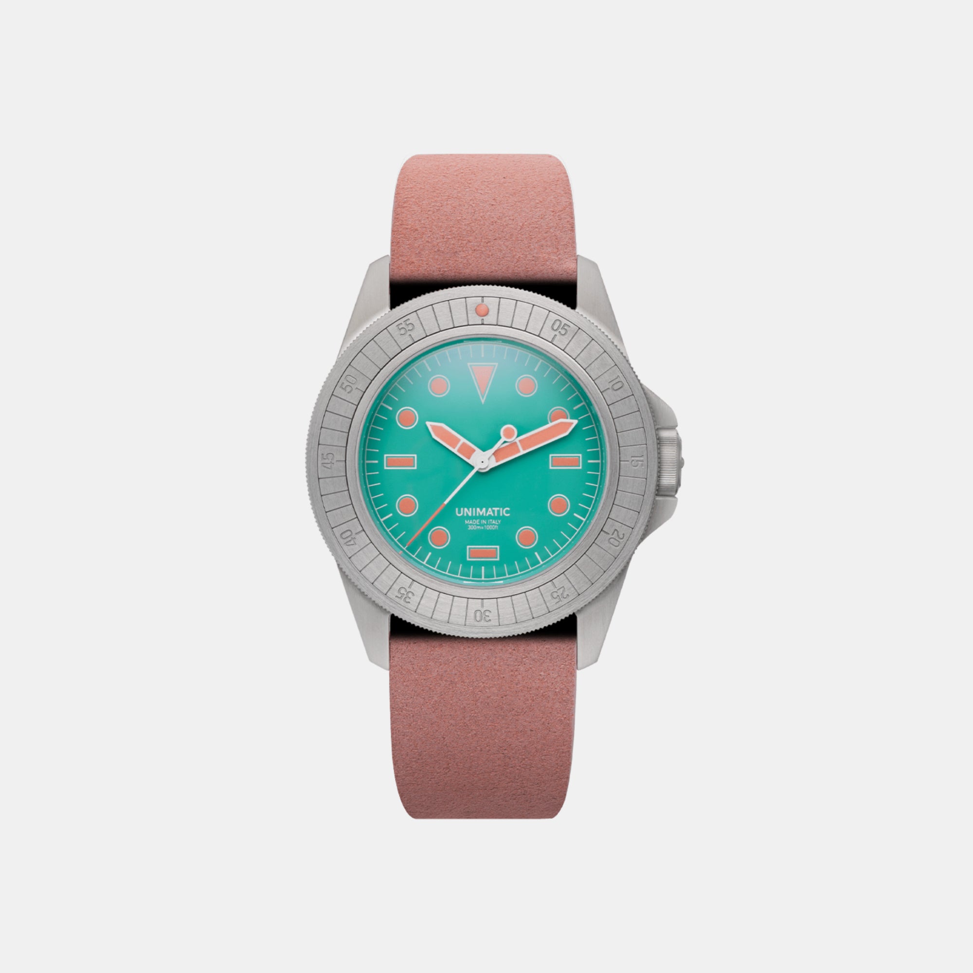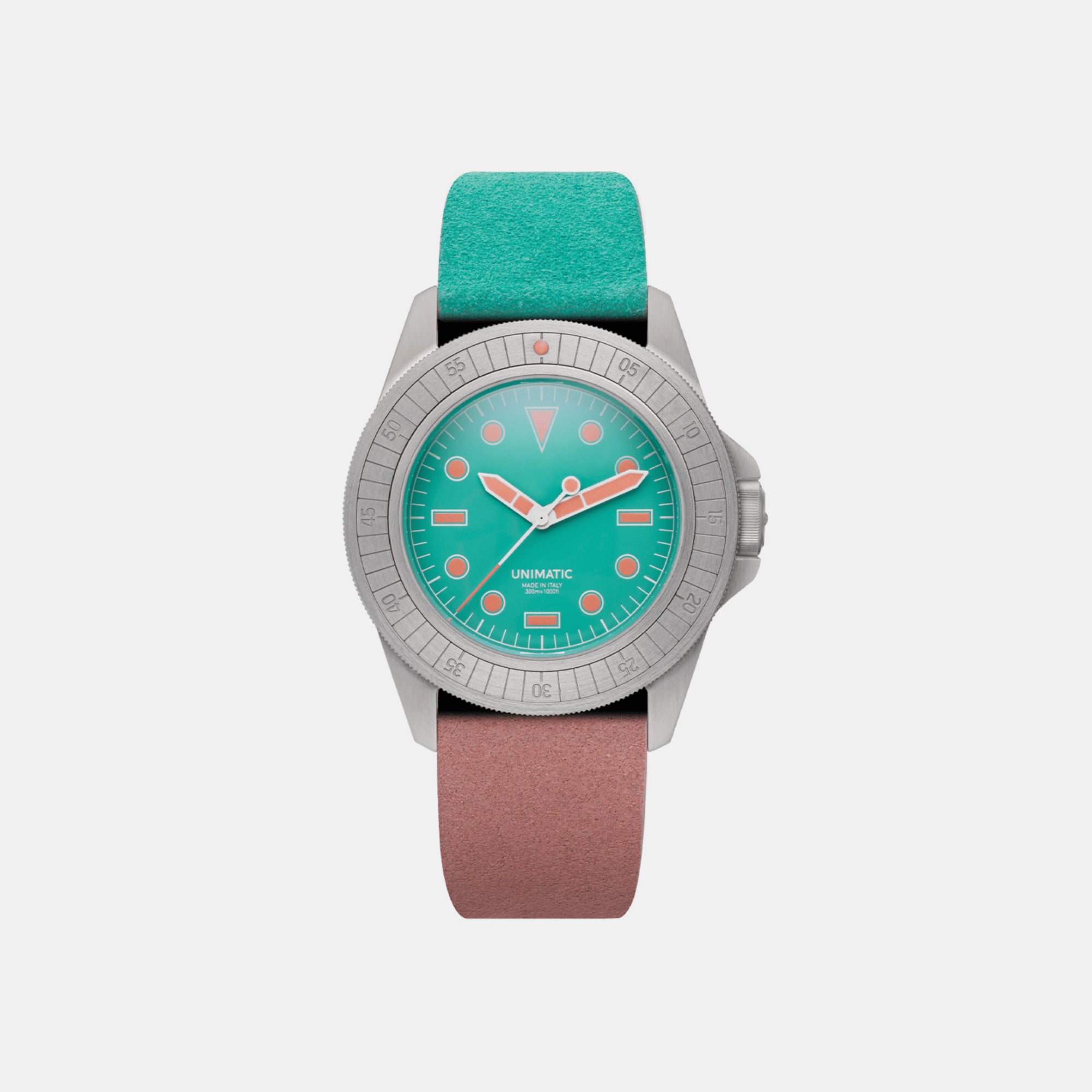 Each watch comes with two colorful suede quick-release straps — one in verde acqua and one in blush pink — both with RIOCAM lining and brushed stainless steel hardware signed UNIMATIC.
