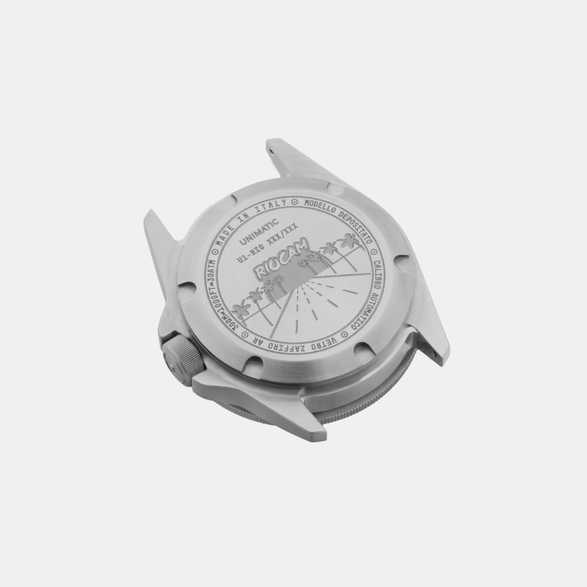The UNIMATIC x RIOCAM screw-down caseback is individually numbered and covered by a 24-month worldwide warranty.