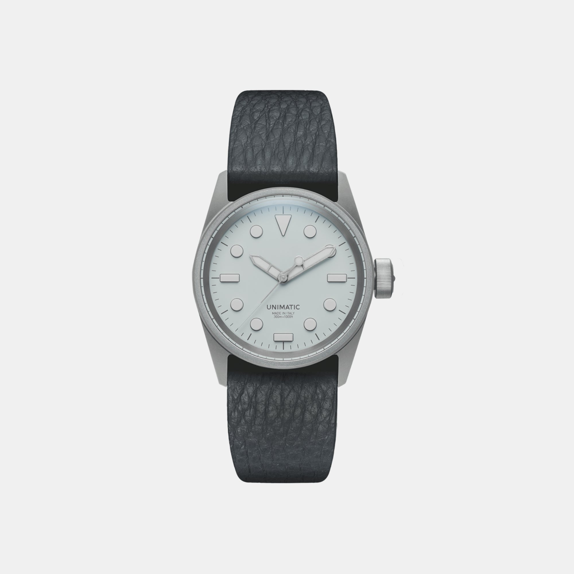 The watch comes on a fumo deer leather two-piece quick-release strap with sandblasted stainless steel hardware signed UNIMATIC, fitting 22mm lugs.