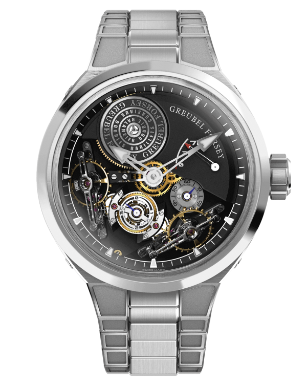Movement with manual winding, Double Balancier, hours and minutes, small seconds, spherical constant differential rotation in 4 minutes, power reserve.