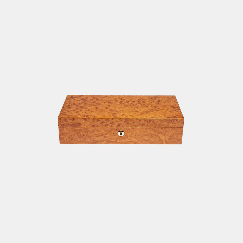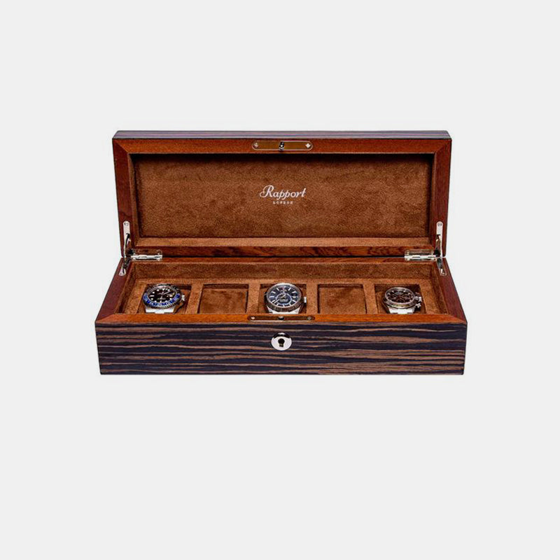 Solid wood, handcrafted five watch collector box, finished off with five layers of hand-applied lacquer to give it a luxurious lustre. The hinges together with the lock and key are gold plated and the interior is finished with a matching suede lining. The watch cushions are adjustable to fit large and smaller watches.