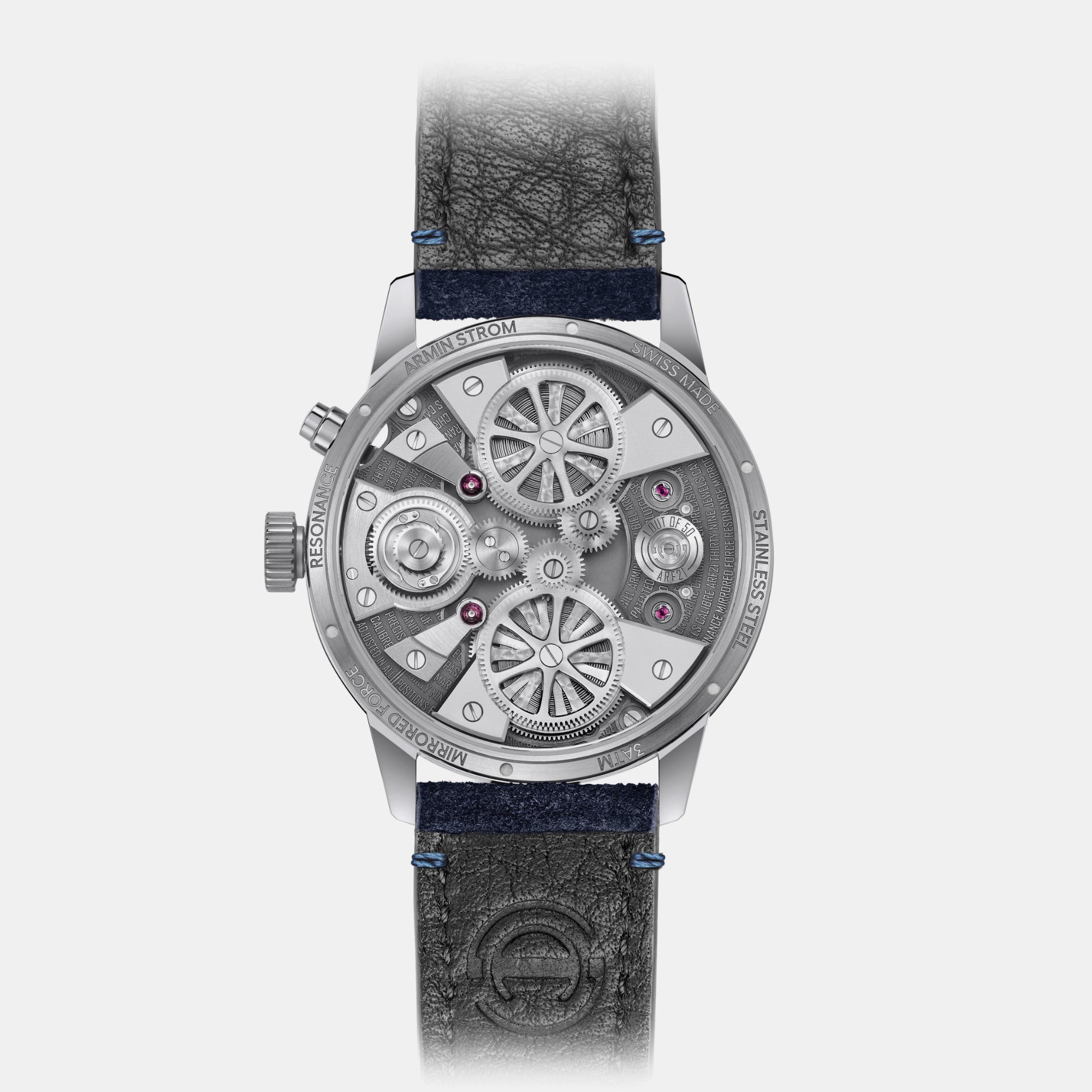 For the first time, the off-center dial of the Mirrored Force Resonance features a sunray guilloché pattern. The lines radiating from the dial's center are decorated using a traditional hand-operated rose engine lathe. The ice blue dial playfully catches and reflects light, creating an even more vibrant and deep view under the sapphire crystal. The new indexes and hands are beveled and polished, adding even more movement to the compelling design. On the left side of the dial, the resonance mechanism takes centre stage: two balances oscillating in opposite directions, connected by Armin Strom’s patented clutch. Two second counters confirm the synchronization of the balances. The anthracite-coloured bridges, surrounded by a 43 mm stainless steel case, remains discreetly in the background as if admiring the composition of the elements. A dark blue Alcantara strap gives the watch a refined look.