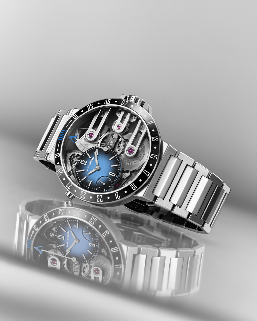 It’s a showpiece of form and function — in stainless steel with a matching bracelet, hand-finished bridges, and limited to just 20 pieces worldwide. This is independent watchmaking with a neon twist.