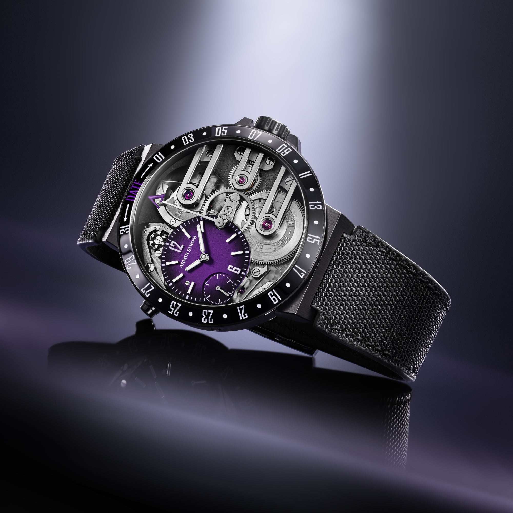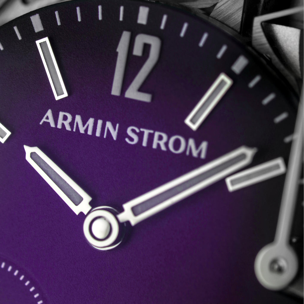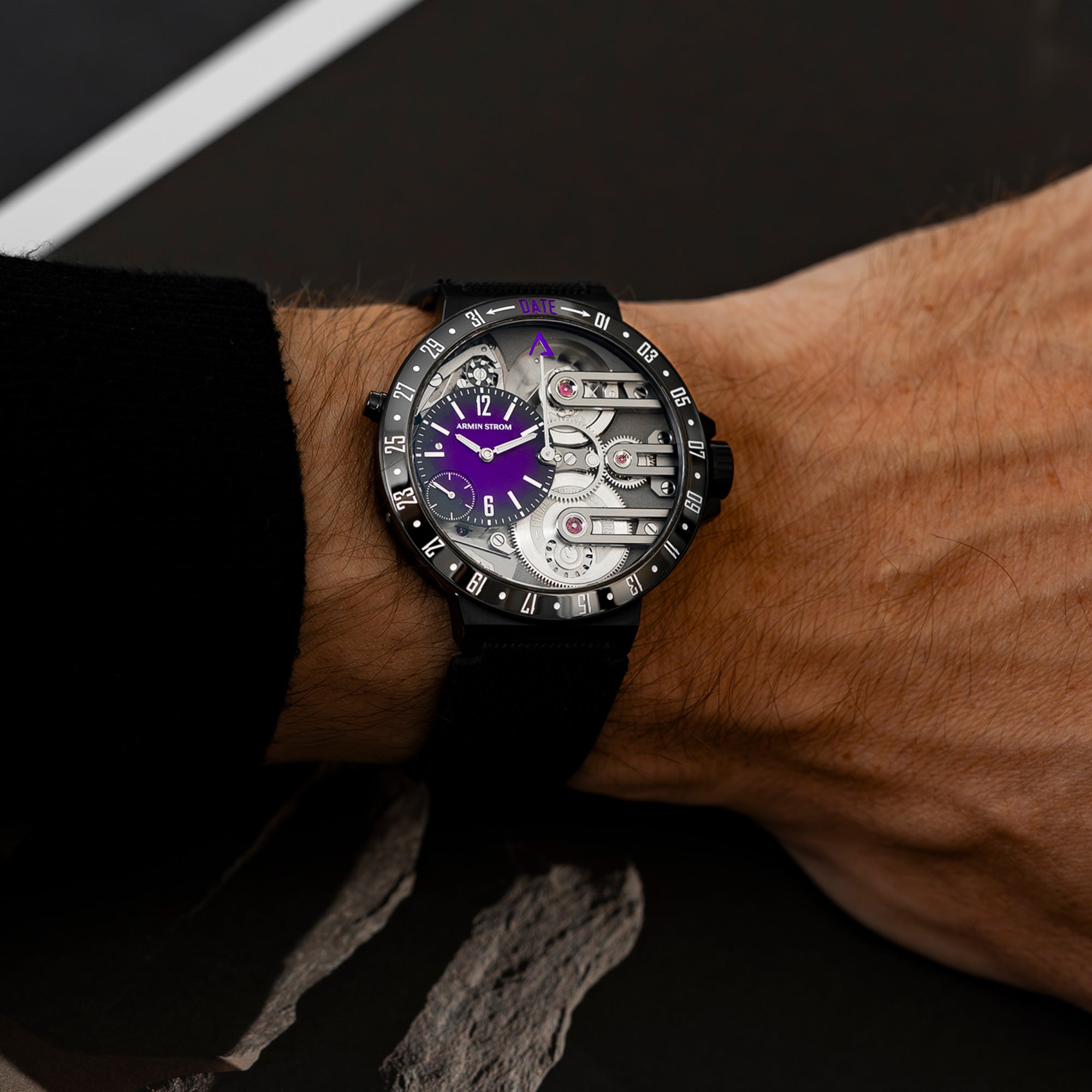 Armin Strom introduces the Orbit Purple: a striking midnight purple fumé dial housed in a black DLC case, paired with a black fabric strap.
