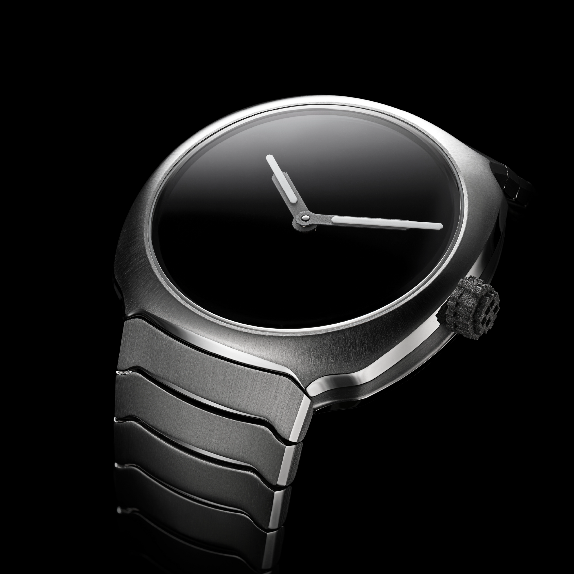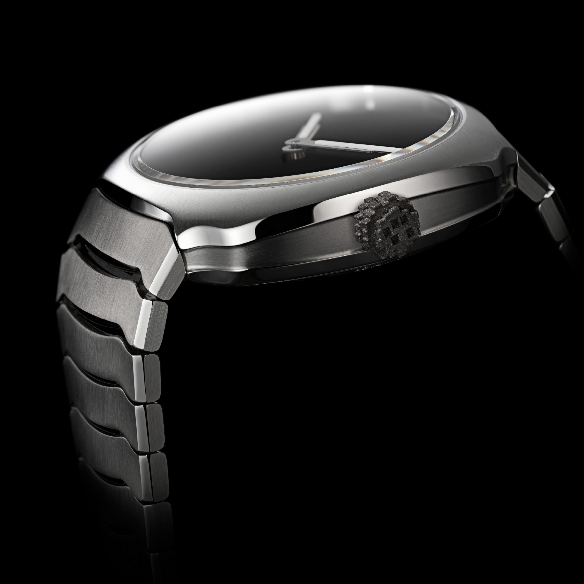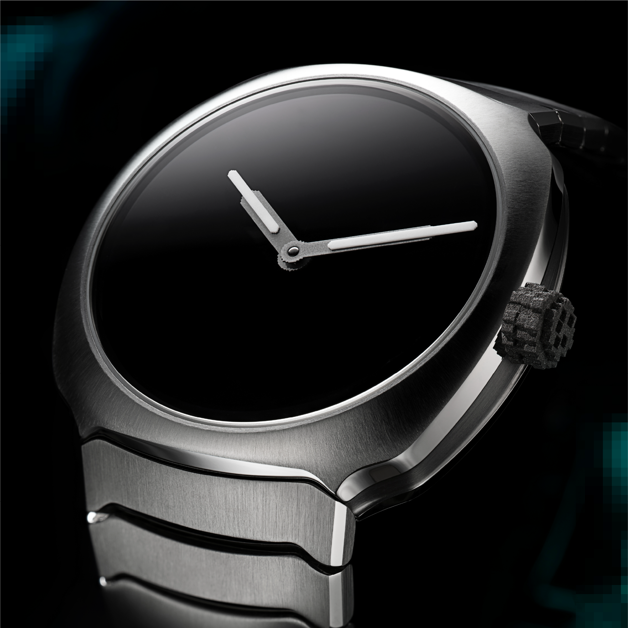 The iconic pixelated elements of the first Genesis return in subtle form: a 3D-printed titanium crown and pixel-style Globolight® inserts on the hands. Digital language translated into physical texture — a reminder of the trilogy’s origin, now rooted in steel instead of the screen.