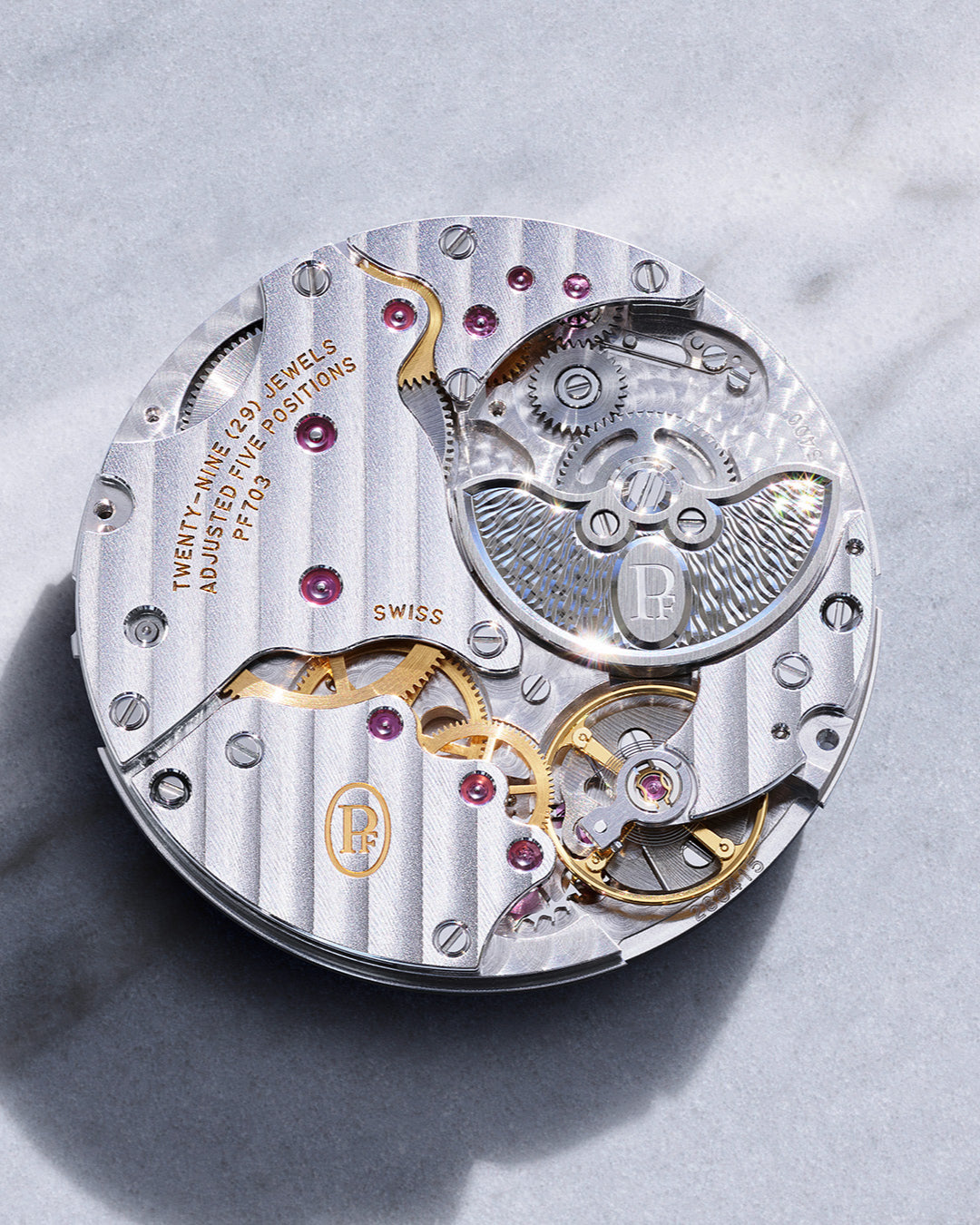 Beneath the surface, the ultra-slim PF703 calibre uses a platinum micro-rotor to keep the watch elegant, balanced, and mechanically refined. Two hands, one philosophy: private luxury, worn daily.